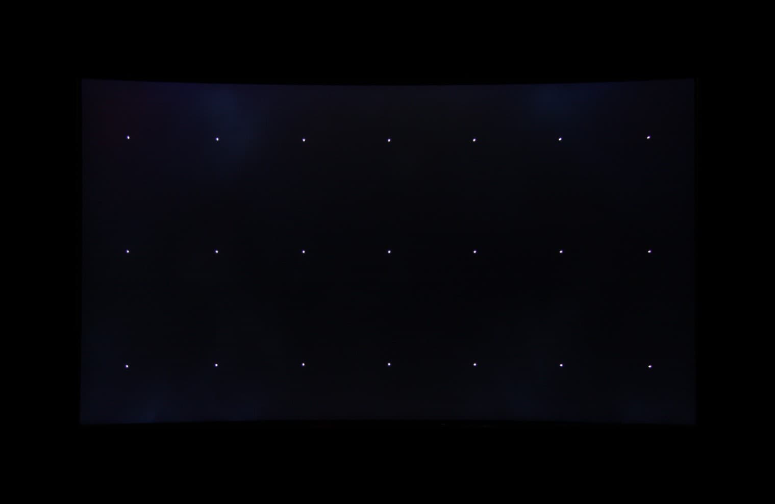 Аппаратные измерения показали, что контрастность даже для этого типа матриц очень высокая, типичное значение контрастности для VA-матриц составляет 3000:1. Равномерность по площади экрана всех трех параметров хорошая. Реальное распределение засветки черного по всей площади экрана увидеть практически невозможно из-за указанной очень быстрой и агрессивной динамической подстройки яркости подсветки. О равномерности черного поля дает представление фотография тестового изображения с сеткой из белых точек: