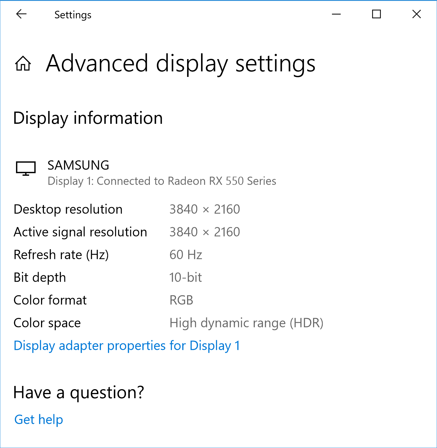 При подключении к компьютеру по HDMI вывод изображения в разрешении 3840 на 2160 пикселей мы получили с кадровой частотой вплоть до 60 Гц включительно. В режимах с разрешением 1600×1200, 1920×1080 и 2560×1440 поддерживается кадровая частота до 120 Гц. Масштабирование к разрешению матрицы ТВ (если оно нужно) выполняется с высоким качеством, без явных артефактов и без потери контраста тонких линий. В данном телевизоре реализована поддержка технологии AMD FreeSync. Для визуальной оценки мы использовали описанную в указанной статье тестовую утилиту. Включение FreeSync позволило получить изображение с плавным движением в кадре и без разрывов. Диапазон поддерживаемых частот, который указывается на панели настроек видеокарты, равен 48—60 Гц для режимов с максимальной кадровой частотой 60 Гц и 48—120 Гц для режимов с максимальной кадровой частотой 120 Гц. В случае сигнала 4К с исходной цветовой четкостью (вывод в режиме RGB или компонентного сигнала с кодированием цвета 4:4:4, использовалась видеокарта с GPU AMD Radeon RX 550), вывод собственно изображения на экран ТВ осуществляется без снижения цветовой четкости. Для того, чтобы изображение было ярким и контрастным в настройках Windows 10 пришлось отключить опцию «HDR and advanced color», однако именно при включении этой опции телевизор сообщает от том, что получает сигнал HDR, а Windows 10 о том, что выводит:
