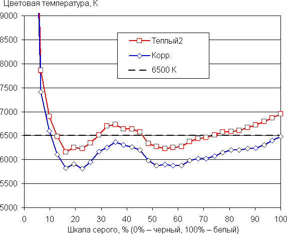 Графики ниже показывают цветовую температуру на различных участках шкалы серого и отклонение от спектра абсолютно черного тела (параметр ΔE) для профиля Стандартный при выборе варианта Теплый2 для настройки Оттенок и после небольшой коррекции цветового баланса настройками усиления трех основных цветов: