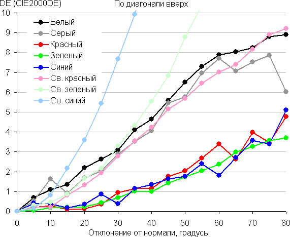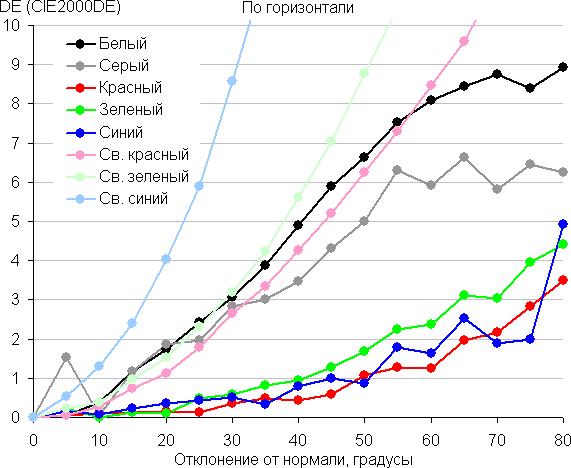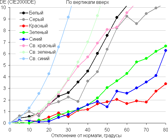 Для количественной характеристики изменения цветопередачи мы провели колориметрические измерения для белого, серого (127, 127, 127), красного, зеленого и синего, а также светло-красного, светло-зеленого и светло-синего полей во весь экран с использованием установки, подобной той, что применялась в предыдущем тесте. Измерения проводились в диапазоне углов от 0° (датчик направлен перпендикулярно к экрану) до 80° с шагом в 5°. Полученные значения интенсивностей были пересчитаны в отклонение ΔE относительно замера каждого поля при перпендикулярном положении датчика относительно экрана. Результаты представлены ниже:
