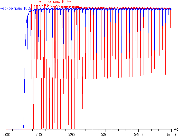Скорость работы данной функции можно оценить по графику ниже, на котором показано, как увеличивается яркость (вертикальная ось) при переключении с черного поля (после 5 секунд вывода) на белое в случае, когда площадь черного поля составляет 100% от площади экрана (при этом подсветка на черном поле выключается совсем) и когда площадь черного поля 10% (этого недостаточно для включения динамической подстройки яркости) :