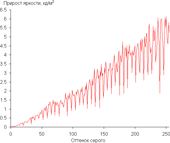 Для оценки характера роста яркости мы измерили яркость 256 оттенков серого (от 0, 0, 0 до 255, 255, 255) при подключении к ПК в режиме RGB при 3840×2160 и 60 Гц, параметр Гамма в настройках ТВ равен BT.1886, BT.1886 = 0, Контраст = 50. График ниже показывает прирост (не абсолютное значение!) яркости между соседними полутонами:
