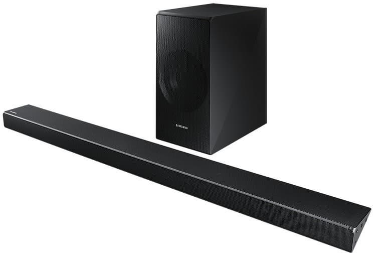 Телевизор можно дополнить внешней акустической системой, подключаемой, например, по Bluetooth. Ради эксперимента мы подключили к телевизору беспроводную портативную колонку — все работало. Также мы опробовали как звучит комплект саундбара Samsung HW-N650, состоящий из собственно саундбара и сабвуфера (фотография с сайта производителя):