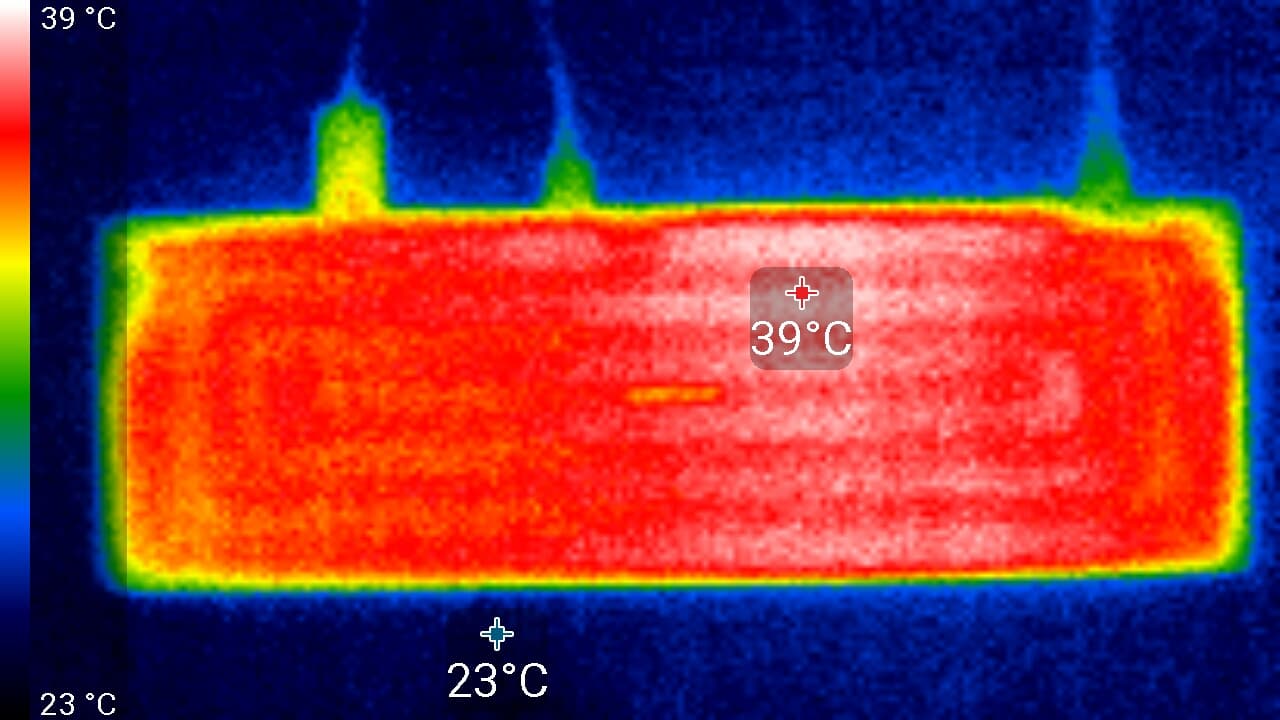 Основным источником тепла является светодиодная линейка по нижнему краю. Максимальный нагрев локальных участков спереди составил 42 °C. Поверхность корпуса модуля One Connect при этом нагревается не очень сильно, до 39 °C.