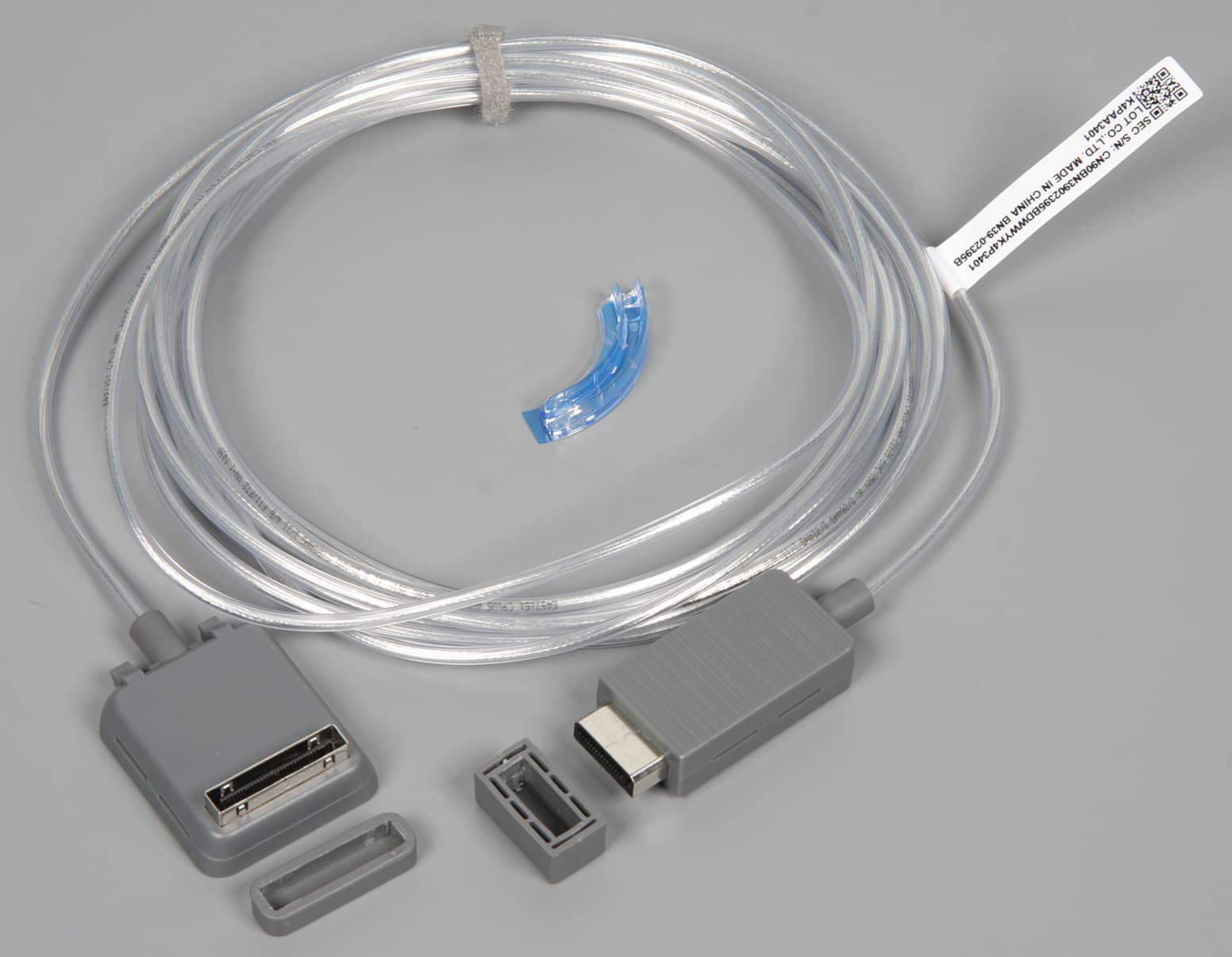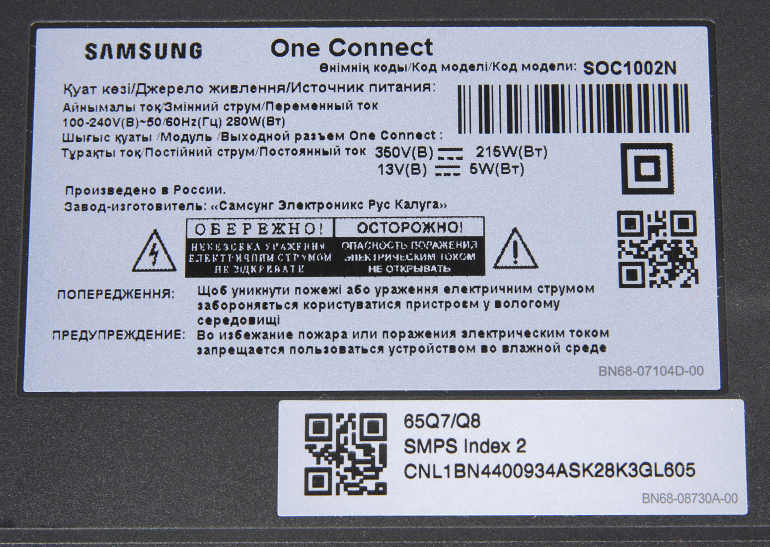 Данные передаются по оптоволокну, а питание — по медным многопроволочным жилам. Разъемы на концах этого кабеля электрические, видимо, в них встроены оптические приемопередатчики. Как указано в руководстве, нельзя допускать резких изгибов кабеля: радиус закругления не должен быть меньше 5 см. Поэтому в местах возможных перегибов кабель нужно уложить в специальные направляющие уголки. Один такой уголок с клейкой поверхностью входит в комплект поставки (есть на фотографии выше). Тонкий кабель подразумевает небольшое сечение токопроводящих жил, но потребление телевизора может достигать несколько десятков ватт, поэтому по длинному кабелю, чтобы избежать больших потер на нагрев, приходится пускать ток под большим напряжением. Наклейка на нижней панели модуля One Connect показывает, что в нем находится источник постоянного тока с напряжением 350 В.