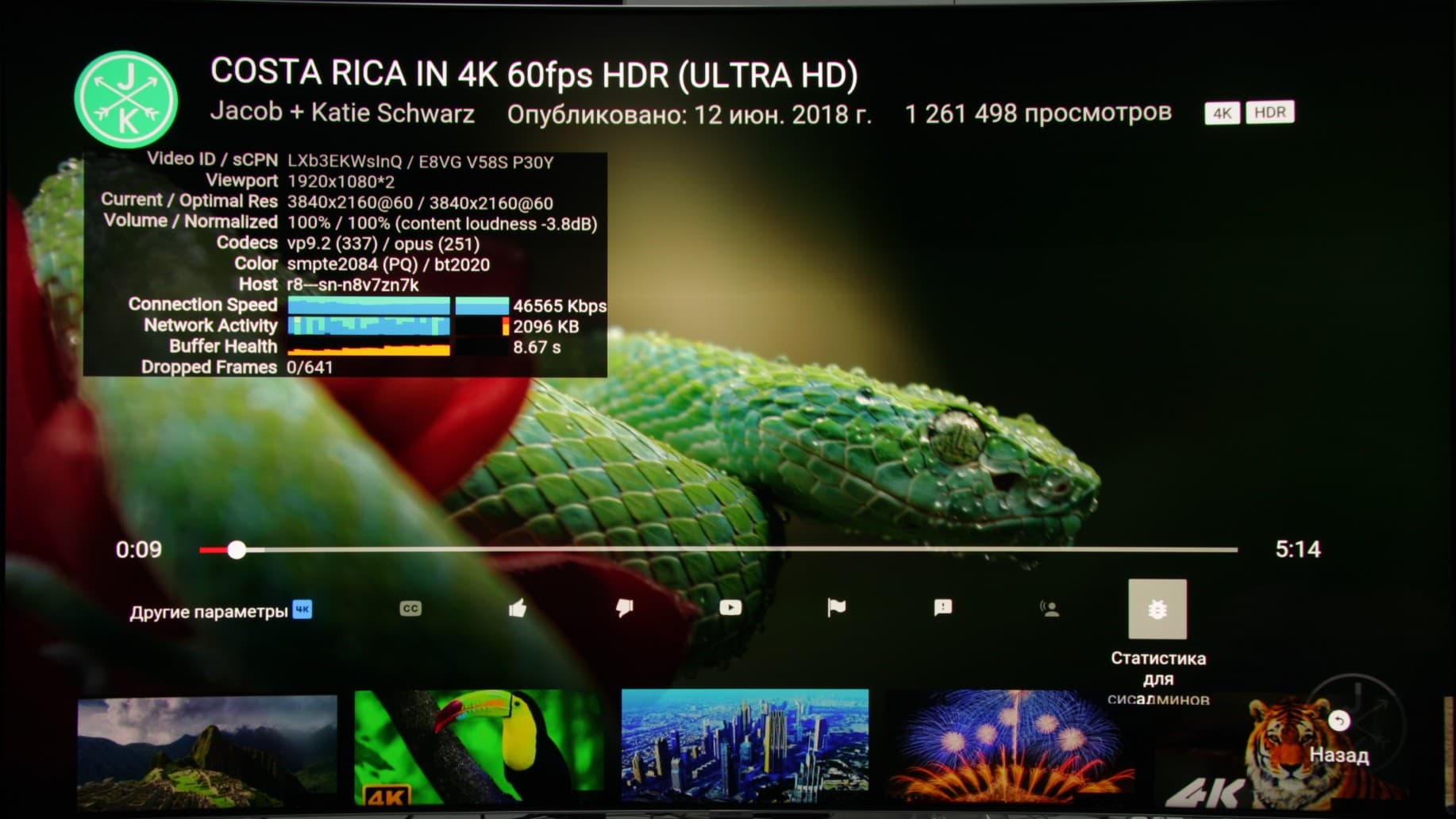 Телевизор поддерживает вывод в режиме HDR. Отметим, что сама концепция HDR заключается не столько в расширенном яркостном диапазоне, сколько в способности устройства выводить изображение без артефактов в том диапазоне яркости, в котором оно в принципе способно показывать. Поддержка 10 бит на цвет как раз и исключает артефакты в виде видимых градиентов там, где их быть не должно. Кстати, в приложении YouTube удалось посмотреть видео в разрешении 4K с HDR и даже с 60 кадр/с.