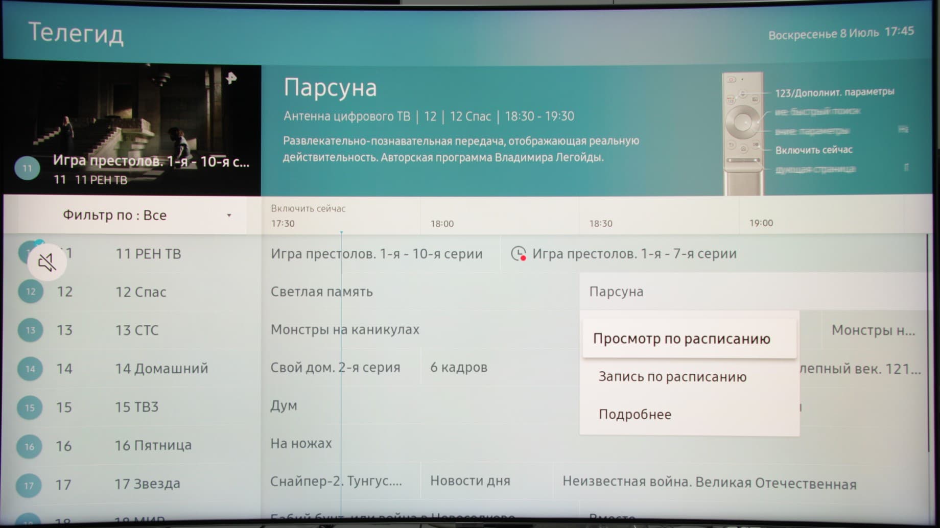 Есть хорошая поддержка электронной программы передач — можно посмотреть, что именно идет на текущем и других каналах, запрограммировать просмотр или запись программы или сериала и т. д (значок часов с красной точкой — запись, а с зеленым треугольником — просмотр).