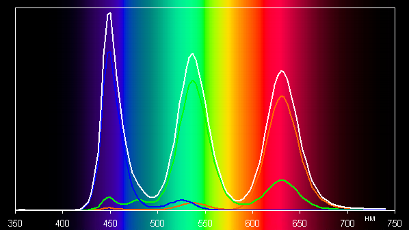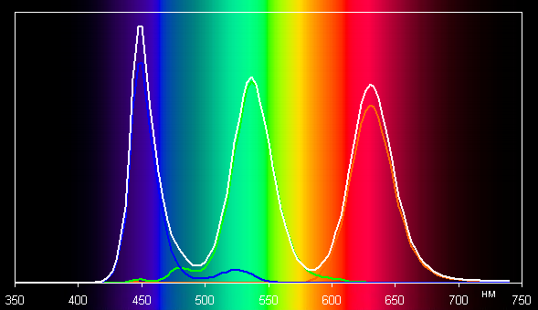Ниже приведен спектр для белого поля (белая линия), наложенный на спектры красного, зеленого и синего полей (линии соответствующих цветов) для профиля Исходный: