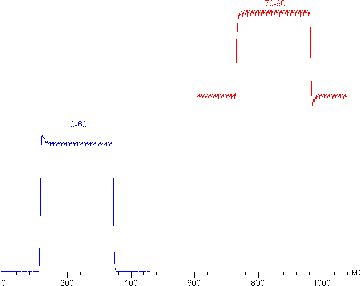 Время отклика при переходе черный-белый-черный равно 12,3 мс (7,5 мс вкл. + 4,8 мс выкл.). Переходы между полутонами происходят в среднем за 13,5 мс в сумме. Такой скорости матрицы достаточно даже для игры в очень динамичные игры. Есть незначительный «разгон» матрицы, не приводящий к видимым артефактам. Приведем примеры зависимости яркости (вертикальная ось) от времени (горизонтальная ось) для переходов между уровнями яркости 0%—60% и 70%—90% в процентах от численного значения оттенка серого: