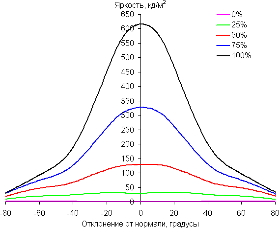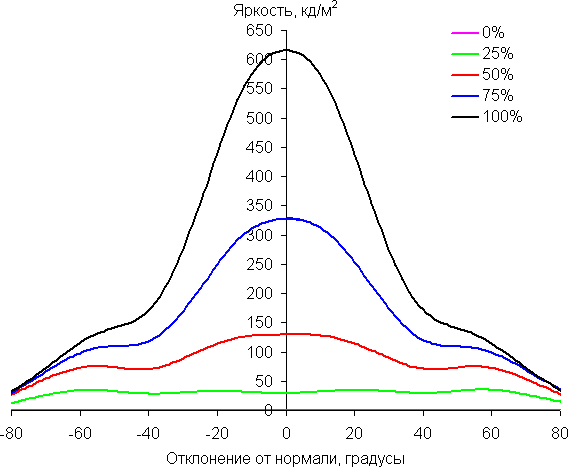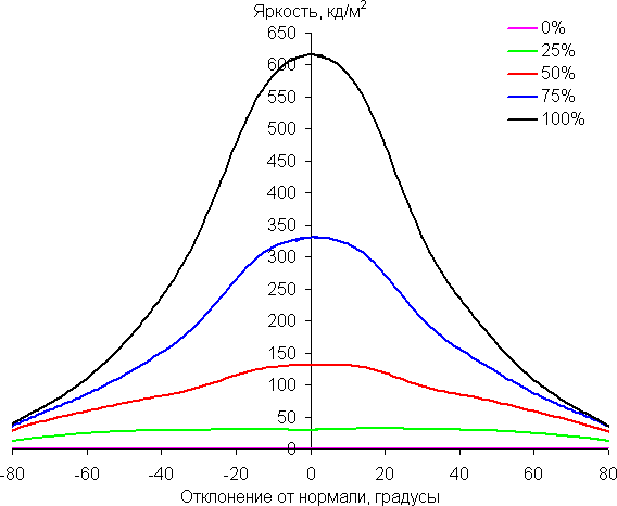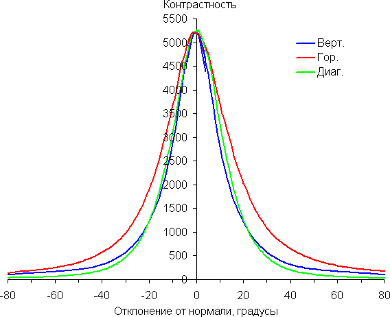 Отметим относительно плавное уменьшение яркости при отклонении от перпендикуляра к экрану во всех трех направлениях, при этом графики яркости полутонов не пересекаются во всем диапазоне измеряемых углов. При отклонении в диагональном направлении яркость черного поля растет немного быстрее, чем в двух других случаях. Однако максимум яркости черного поля все равно меньше, чем в случае типичного телевизора или монитора на матрице IPS. Контрастность при отклонении до ±82° больше всего снижается в диагональном направлении, но все равно остается существенно выше границы в 10:1, а именно 28:1 и 35:1.