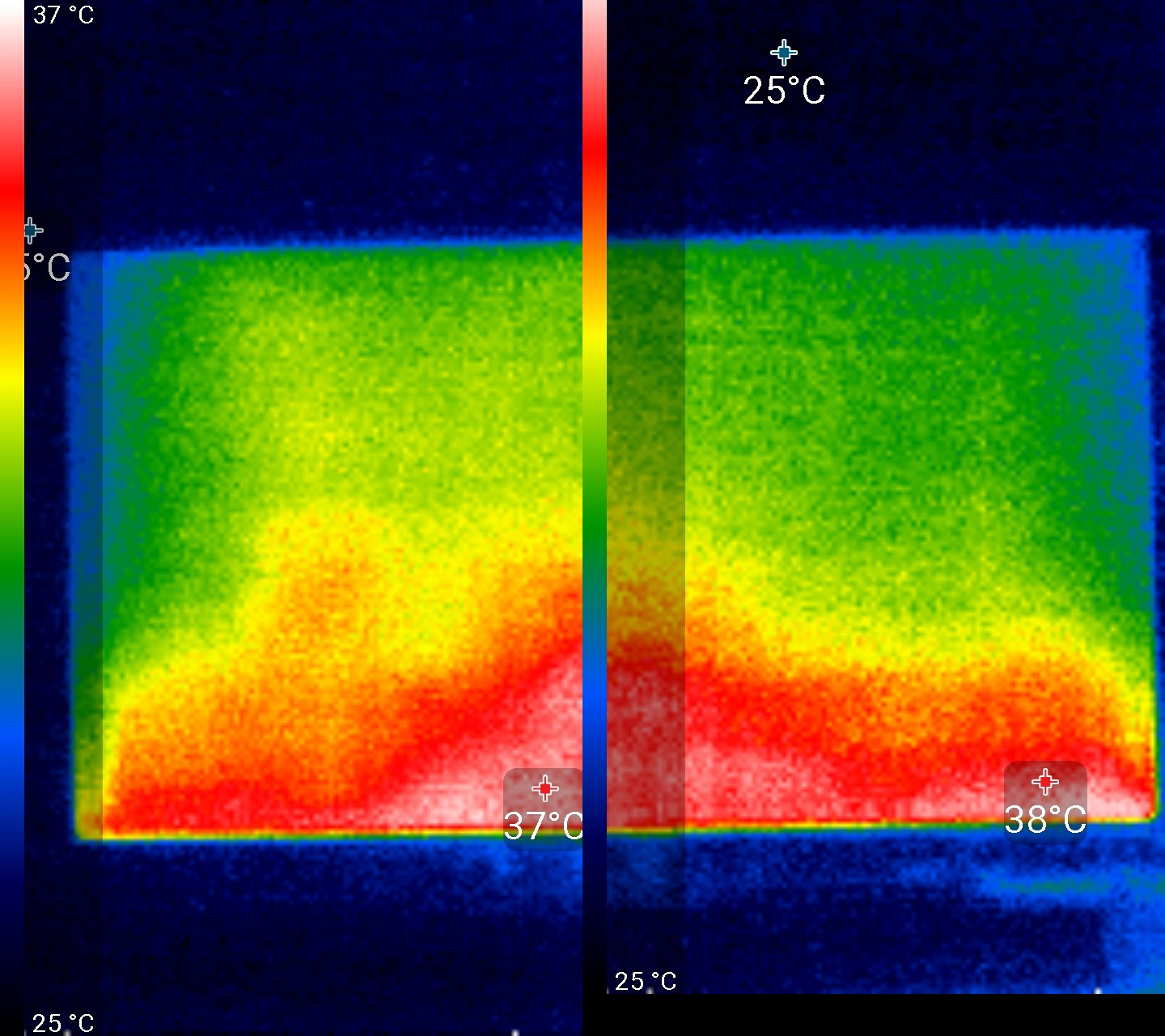 Нагрев телевизора можно оценить по приведенному изображению, составленному из двух снимков с ИК-камеры, полученным после долговременной работы на максимальной яркости в помещении с температурой примерно 24 °C: