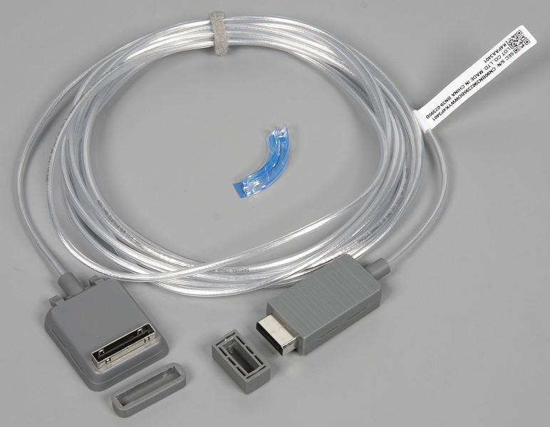 Вынос всех разъемов для подключения питания и внешних устройств — это, во-первых, удобно, так как телевизор можно поставить в нишу или повесить на стену, где доступ к разъемам на задней панели был бы затруднен, а модуль One Connect поместить в удобном для подключения периферии месте. Во-вторых, эстетично, так как телевизор по определению расположен на видном месте и ворох кабелей, подключенных к нему, смотрелся бы некрасиво, но с таким кабелем можно обеспечить малозаметное и аккуратное подключение самого телевизора, а все остальное подключить к модулю One Connect, расположив его в неприметном месте, например в тумбе под телевизором или вообще где-то в стороне. Если длины комплектного кабеля не хватает, то пользователь может приобрести кабель VG-SOCN15 длиной 15 м с четырьмя кабельными фиксаторами в придачу.