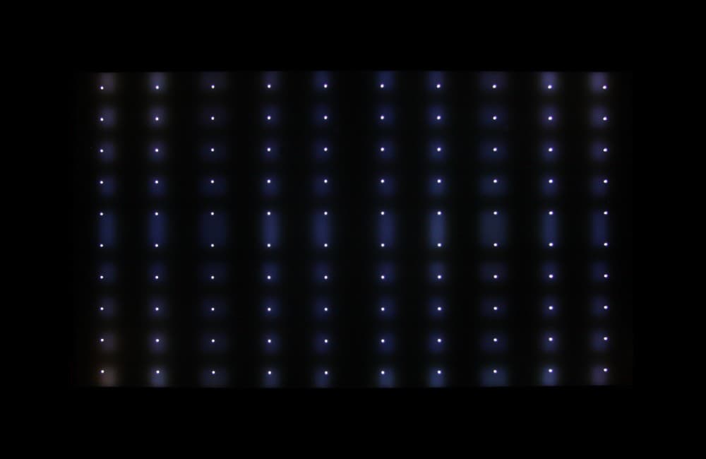 Напомним, что без изменения параметров в сервисном меню пользователь такую картину никогда не увидит, так как будет работать глобальное и локальное затемнение. Так как светодиодов подсветки во много раз меньше, чем пикселей в матрице, то каждый светодиод освещает область из нескольких тысяч пикселей. Из-за этого на некоторых типах изображений могут быть артефакты в виде локальной засветки вокруг или около ярких объектов. Например, в случае тестового изображения с белыми точками: