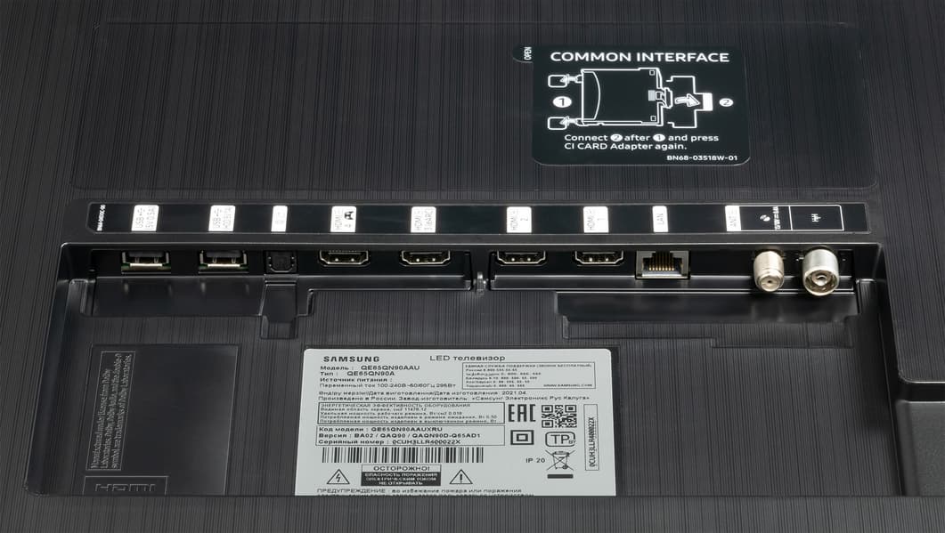 Краткое руководство к телевизору мало что сообщает об особенностях функционирования входов, в основном источником информации служат надписи у разъемов. Аналоговых входов и выходов для видео- и аудиосигналов нет никаких, нет даже традиционного выхода на наушники. Предполагается, что при необходимости пользователь будет использовать беспроводные наушники с интерфейсом Bluetooth.