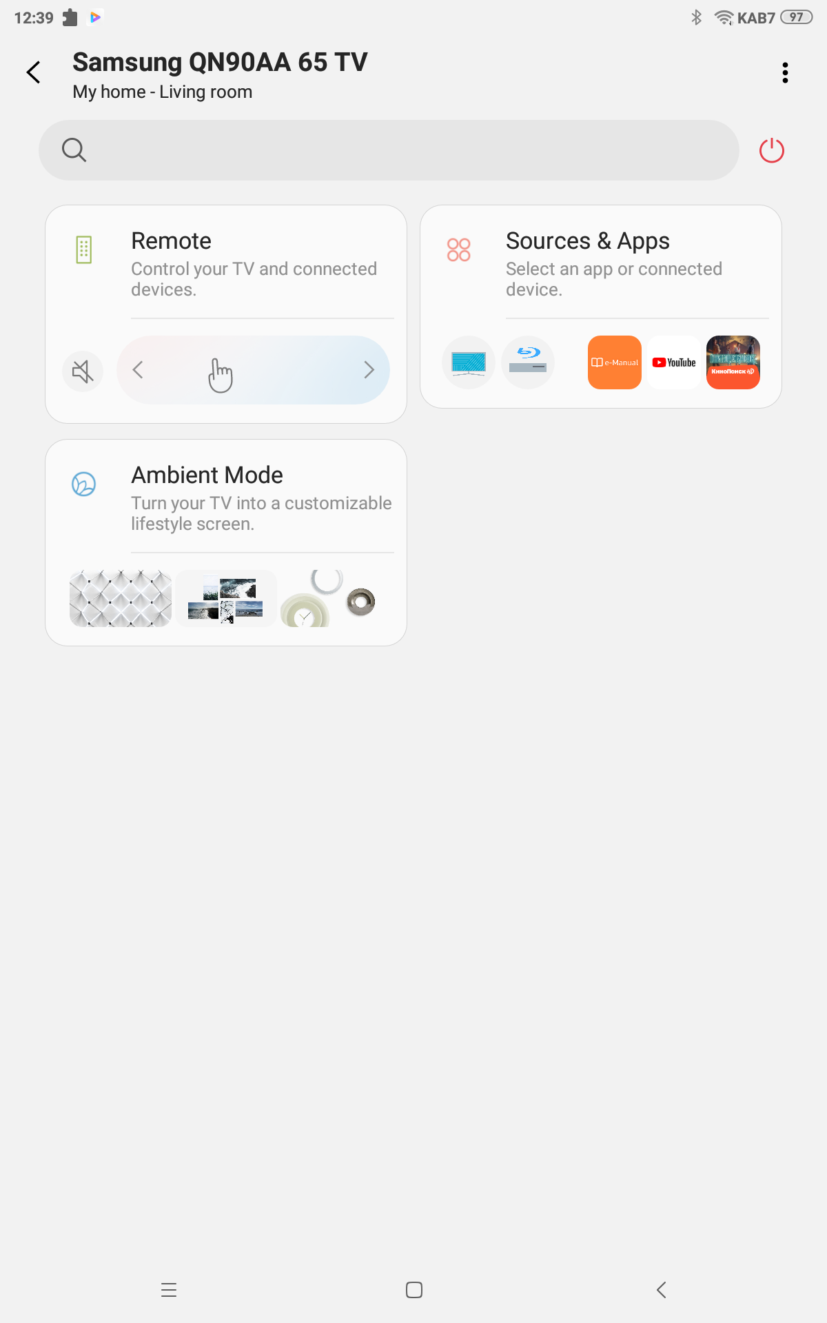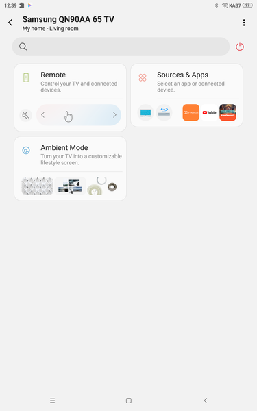Телевизором можно управлять посредством мобильного устройства с помощью фирменного приложения SmartThings для Android и iOS. В данном ПО телевизор представляется как одним из устройств «умного дома», входящих в экосистему SmartThings. Для доступа к устройствам SmartThings используется облачный сервис, поэтому телевизором можно управлять из любого места, где есть доступ к Сети, хотя в данном случае это не дает особых преимуществ. В ПО SmartThings в главном окне модуля работы с телевизором есть виртуальный пульт ДУ с кнопками и панелью координатного ввода, панель выбора входов и приложений. Дополнительно с помощью SmartThings можно настраивать работу режима Ambient.