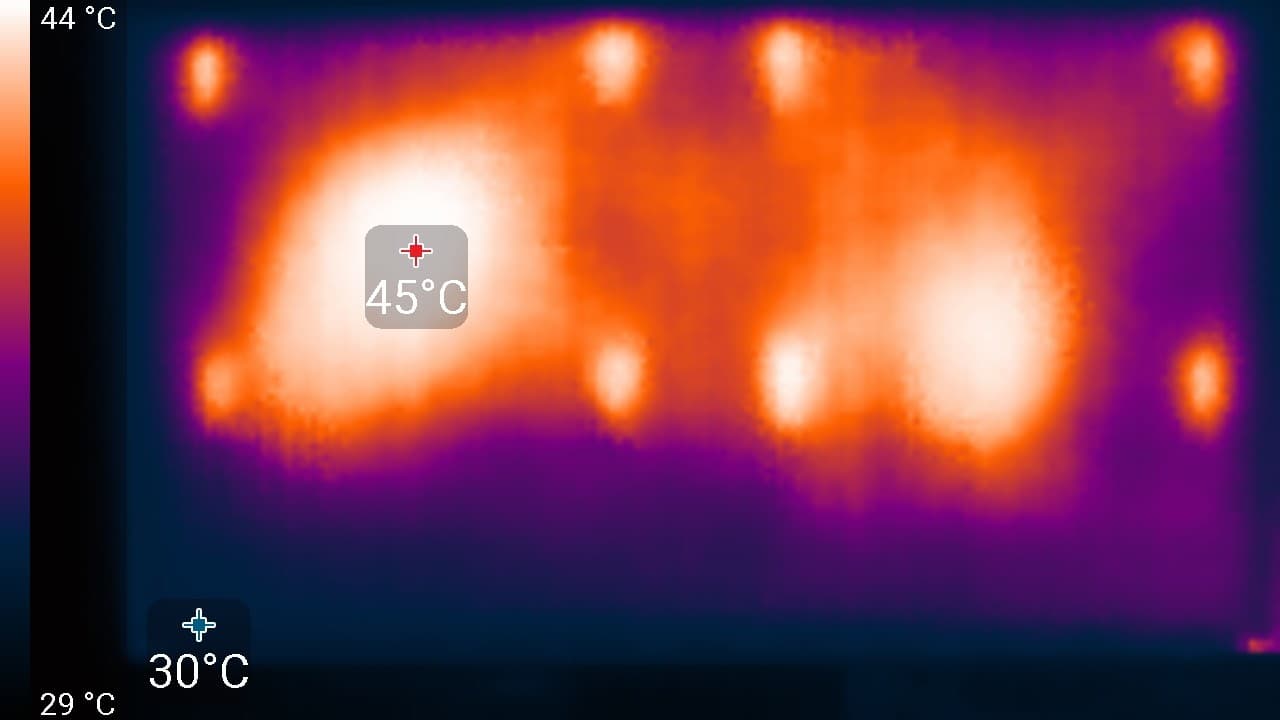 Нагрев телевизора можно оценить по приведенному снимку с ИК-камеры, полученному после долговременной работы на максимальной яркости в помещении с температурой примерно 24 °C:
