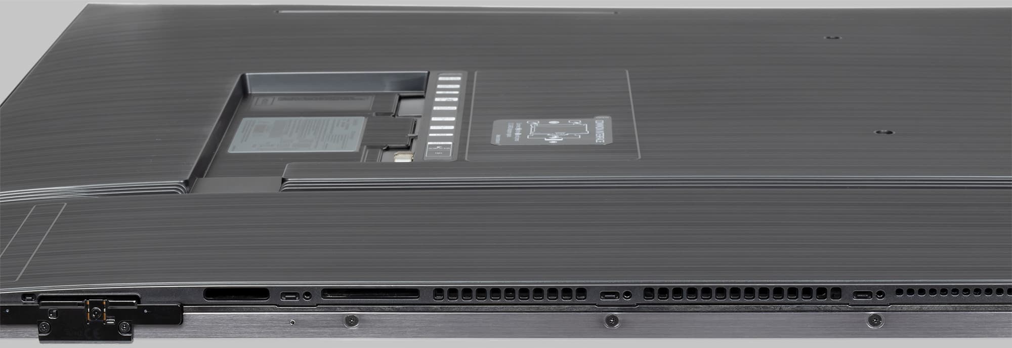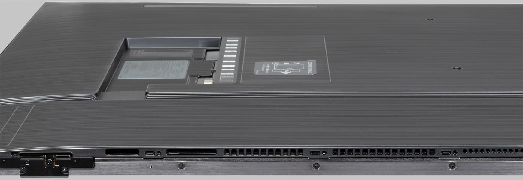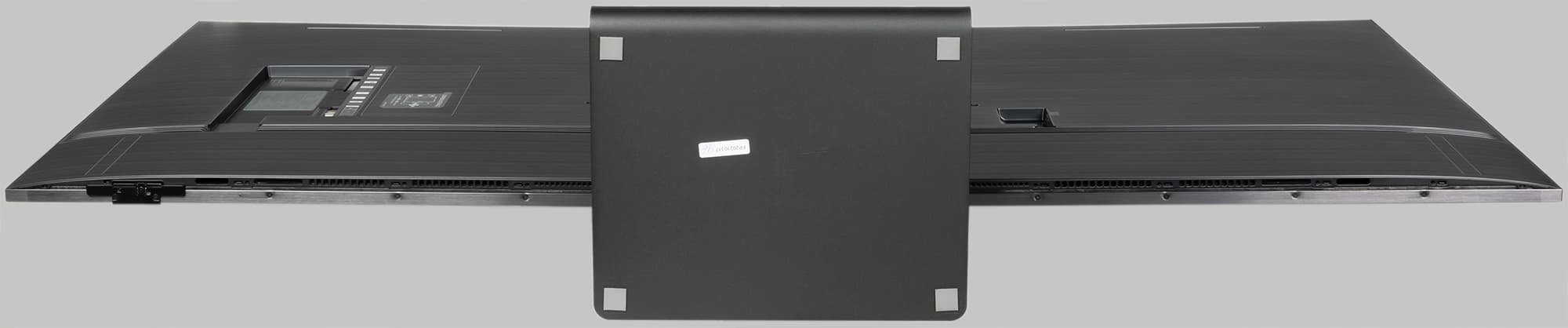 Воздух для охлаждения электроники проходит через решетки на нижнем торце корпуса и выходит через пару решеток в верхней части задней панели. Телевизор имеет полностью пассивное охлаждение. Где-то за решетками на нижнем торце расположены встроенные среде-высокочастотные громкоговорители. Кроме того, на нижнем торце есть выходные отверстия рупоров или фазоинверторов низкочастотных громкоговорителей. В описании производитель упоминает, что в телевизоре всего установлено шесть громкоговорителей (схема 4.2).