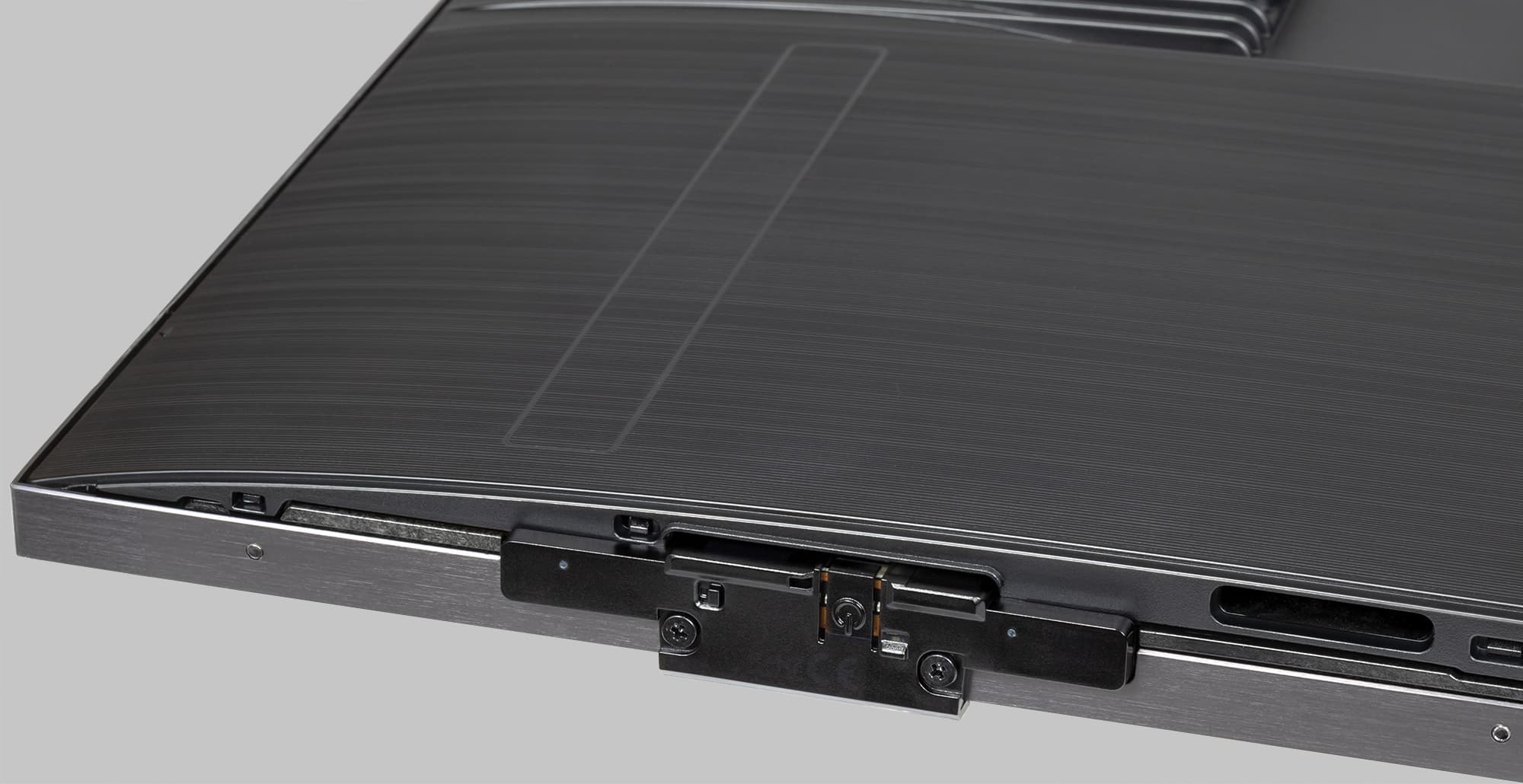 Справа на нижнем торце закреплен небольшой модуль из тонированного пластика. В нем размещены ИК-приемник пульта ДУ, ИК-излучатели, датчик внешней освещенности, индикатор состояния и, видимо, микрофон. Кроме того, снизу на модуле находятся единственная кнопка управления (ей с помощью короткого меню можно очень ограниченно управлять телевизором, когда пульт не доступен) и выключатель микрофона. Индикатор неяркий, в дежурном режиме он светится красным, в обычных ситуациях пользователь его не видит.