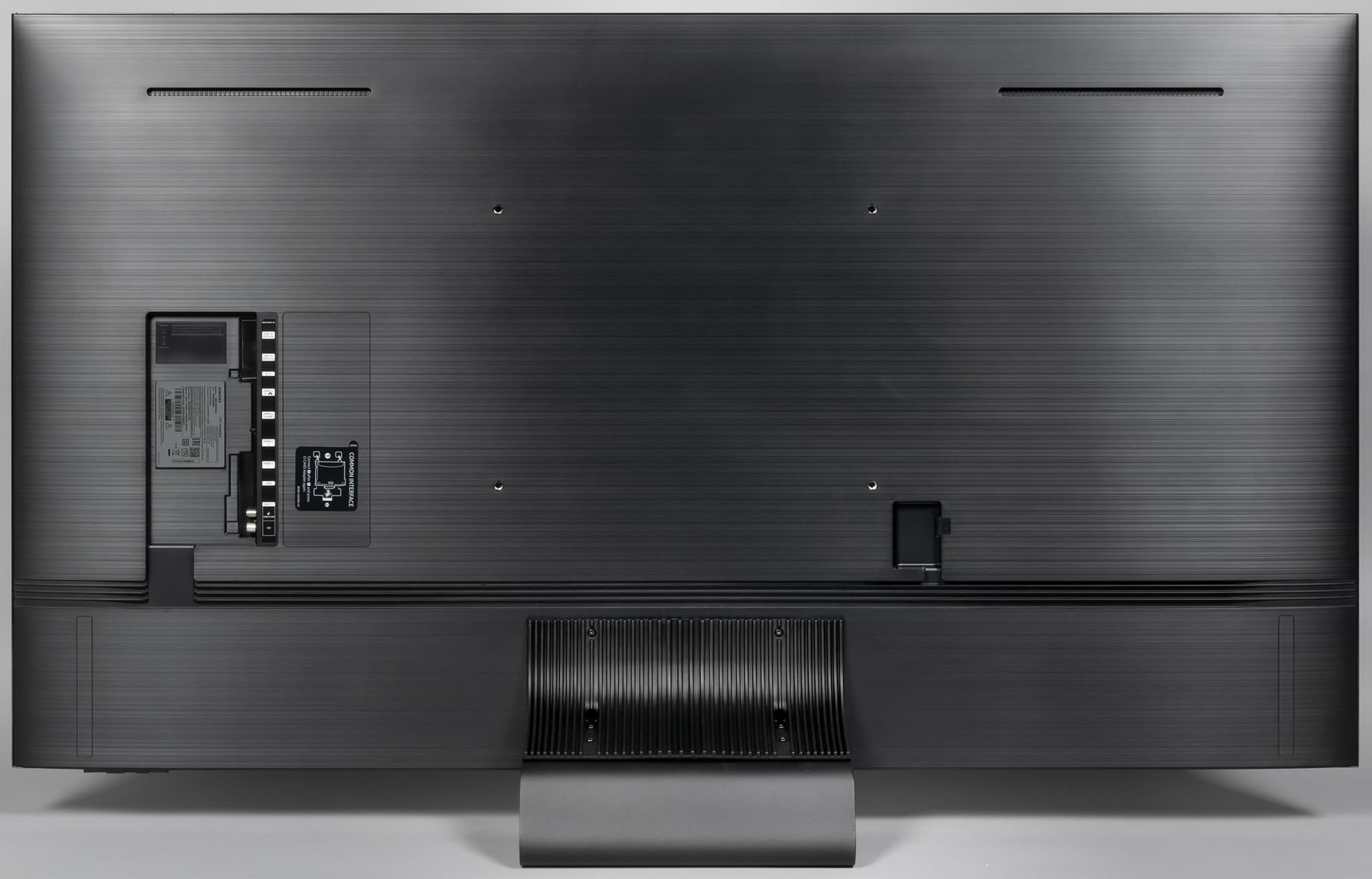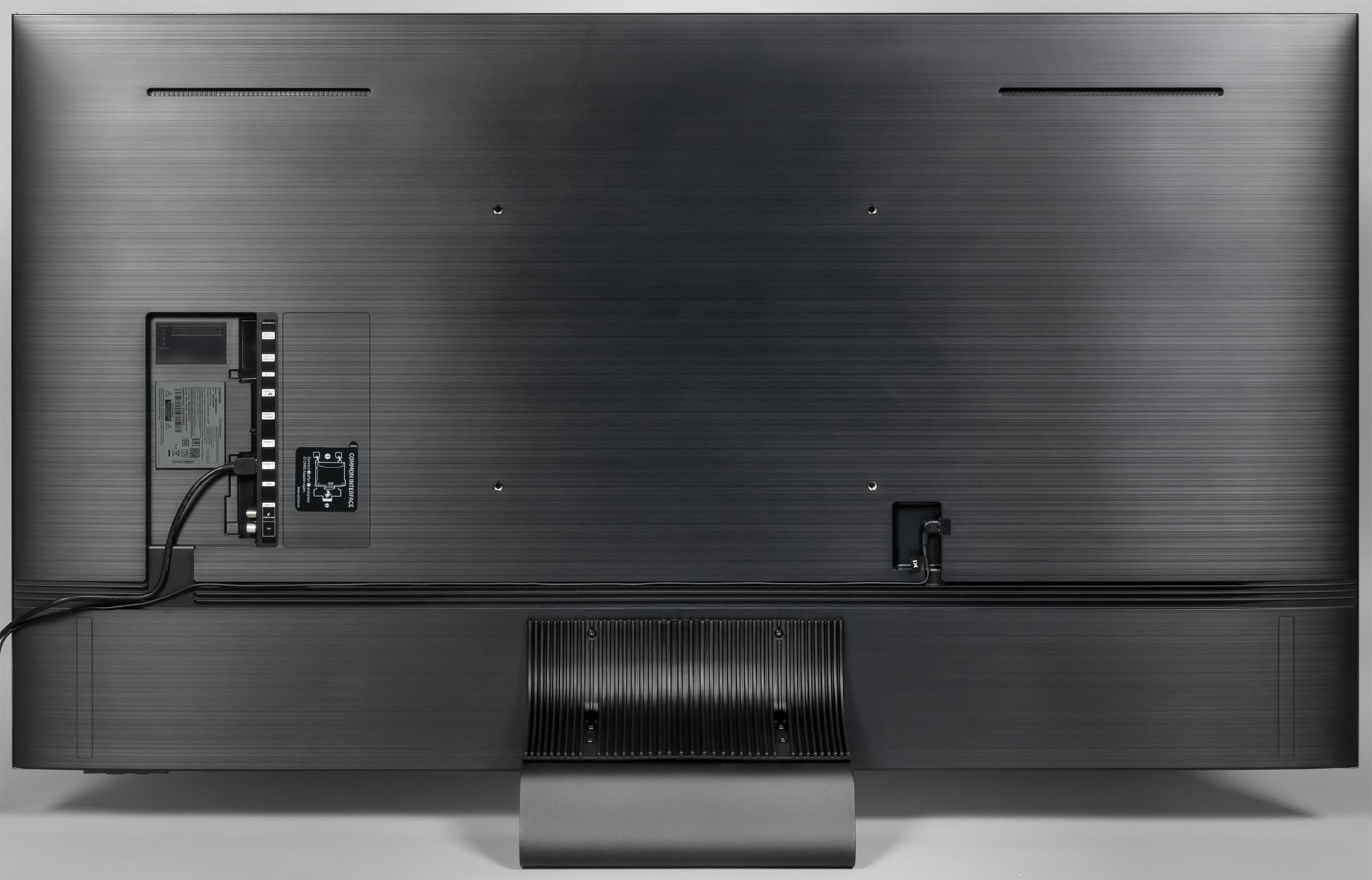 Несмотря на большую диагональ, телевизор оснащен центральной подставкой, что позволит устанавливать телевизор на не очень широкие тумбы. Подставка состоит из двух частей — U-образного основания и невысокой L-образной пластиковой стойки. Основание подставки представляет собой изогнутую стальную пластину толщиной 5,5 мм, имеющую стойкое черное матовое покрытие. Снизу на основание наклеены резиновые квадратные противоскользящие накладки.