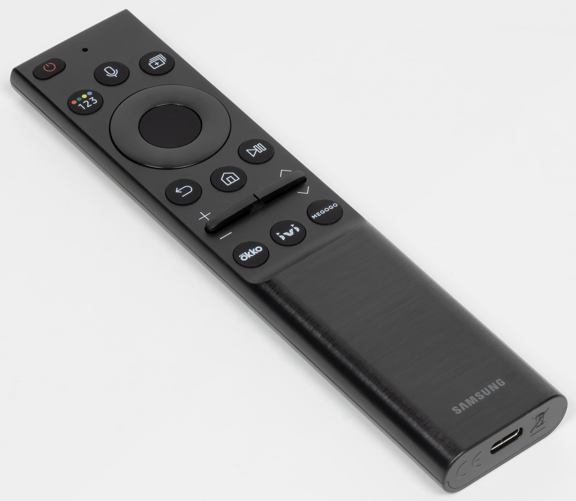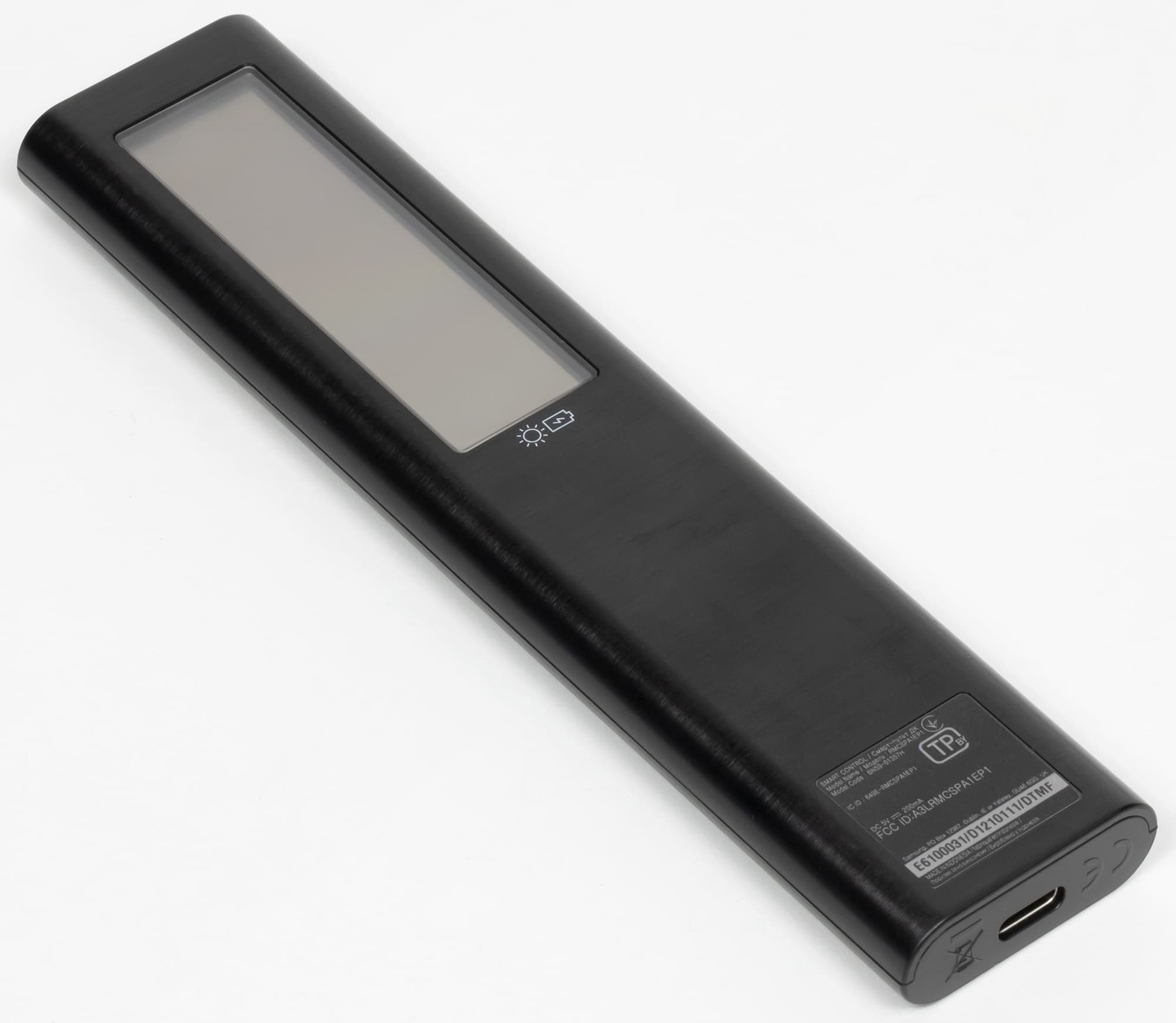 Пульт имеет типичный для топовых ТВ Samsung внешний вид. Пульт небольшой (161×36×13 мм) и легкий (59 г). Особенностью этого пульта является работа от встроенного аккумулятора, который заряжается от солнечной батареи (класть на солнце не обязательно, достаточно и искусственного освещения) или от порта USB-С на ближнем к пользователю торце.