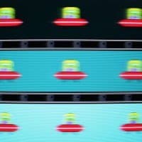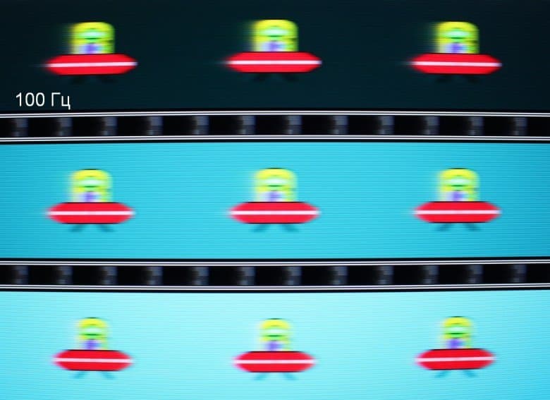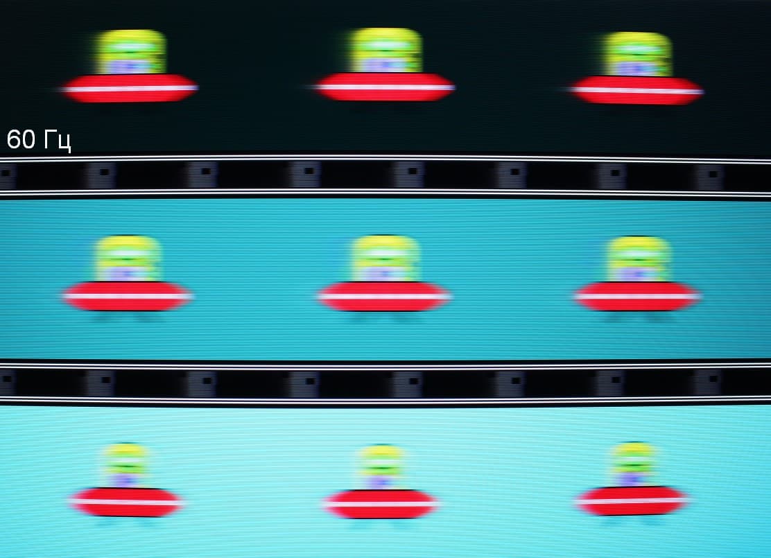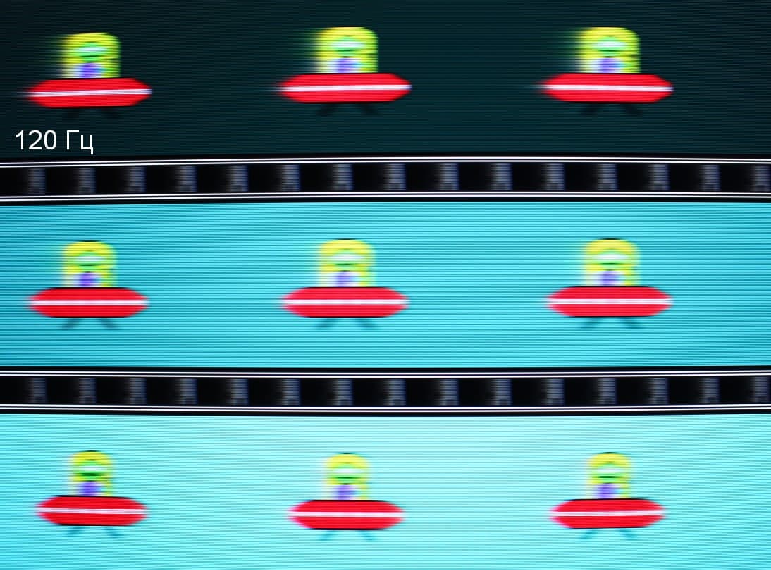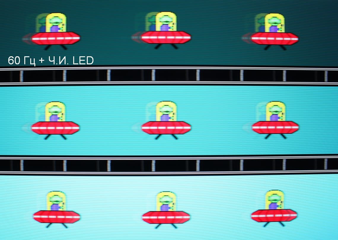 Видно, что при прочих равных условиях четкость изображения повышается по мере роста частоты обновления, а включение режима Ч.И. LED существенно повышает четкость, но и приводит к появлению неярких теней позади летающей тарелки. С выключенным Ч.И. LED артефакты, вызванные разгоном — светлая кайма на темном фоне, — несущественные.