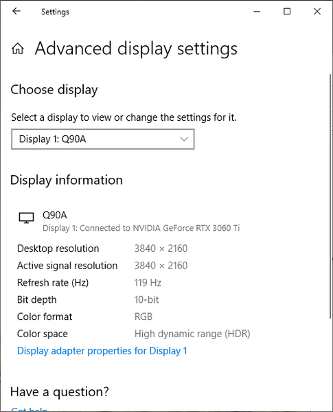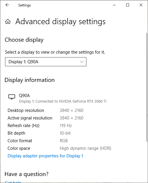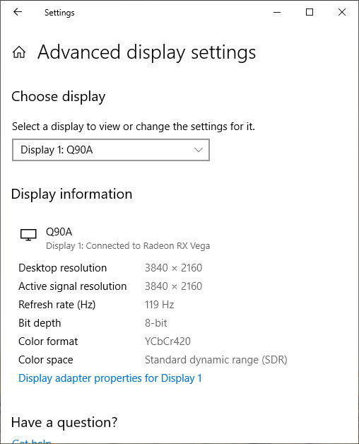 Под Windows 10 вывод в режиме HDR на данный телевизор возможен при выборе соответствующих опций в настройках дисплея. При разрешении 4К и 120 Гц вывод можно получить в режиме 8 бит на цвет, дополненных динамическим смешением цветов, видимо, с помощью видеокарты на аппаратном уровне, или 10 бит на цвет (динамическое расширение до 10 бит выполняется уже самим ТВ). Воспроизведение тестовых видеороликов с 10-битным цветом и плавными градиентами показало, что заметность переходов между оттенками гораздо ниже, чем при простом 8-битном выводе без HDR, однако ТВ с этим справляется чуть хуже, чем видеокарта. Цвета контента HDR близки к ожидаемым. В режиме HDR максимальная яркость такая же, что и в режиме SDR.