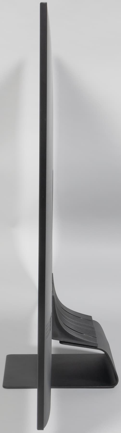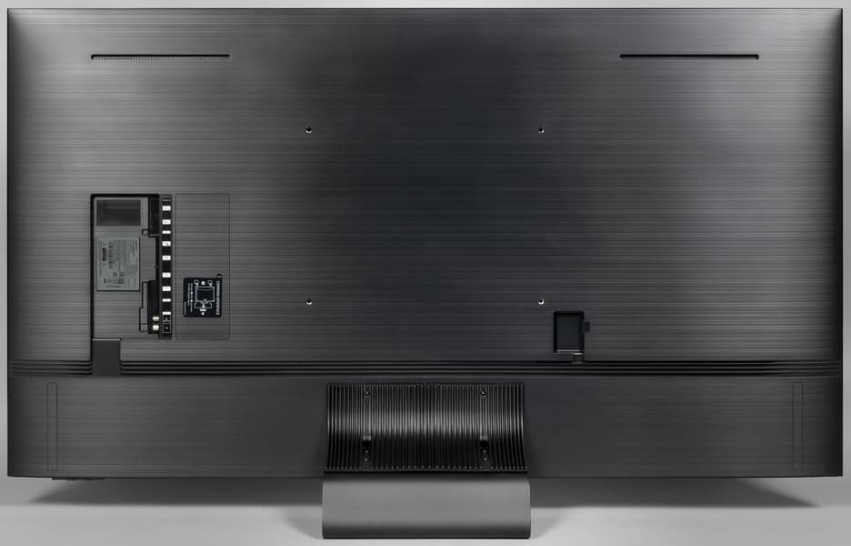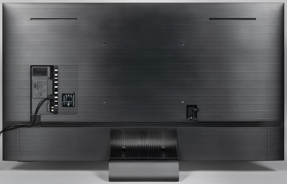 Дизайн строгий, декоративные элементы отсутствуют, в основном используется черный (sand black в терминологии производителя) и серый цвета (черный титан). Телевизор выглядит аккуратно как спереди, так и сзади. Экран не имеет рамок, в том смысле, что на его монолитной поверхности нет накладных заметно выступающих вперед за плоскость элементов, есть только узкое обрамление из алюминиевого профиля. Этот профиль анодирован и окрашен в серый цвет. Передняя грань профиля скошена наружу, поэтому появление бликов маловероятно. Ширина профиля всего14 мм, но корпус сзади слегка выпуклый, поэтому максимальная толщина больше, но все равно телевизор смотрится тонким. По самому низу плоскости экрана идет узкая (примерно 5 мм) полоска из пластика. Внешняя поверхность матрицы зеркально-гладкая и относительно устойчивая к повреждениям. Очень эффективный антибликовый фильтр снижает яркость отраженных объектов до такой степени, что зеркальность экрана просмотру не мешает, если только прямо напротив экрана нет очень ярких точечных источников света. При этом загрязнения не очень сильно снижают антибликовые свойства.