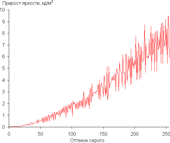 Для оценки характера роста яркости мы измерили яркость 256 оттенков серого (от 0, 0, 0 до 255, 255, 255) при подключении к ПК в режиме RGB при 3840×2160 и 120 Гц, параметр Гамма в настройках ТВ — BT.1886, Контраст = 38. График ниже показывает прирост (не абсолютное значение!) яркости между соседними полутонами: