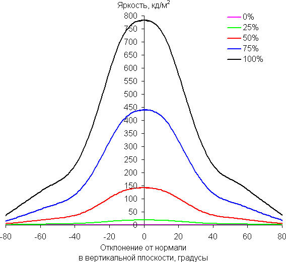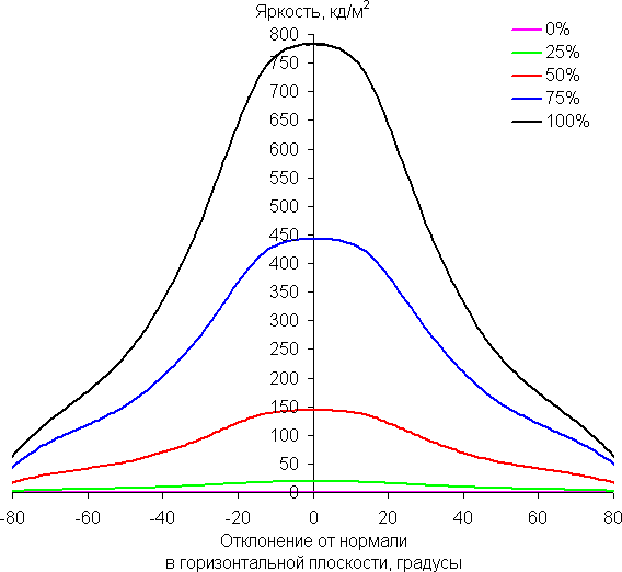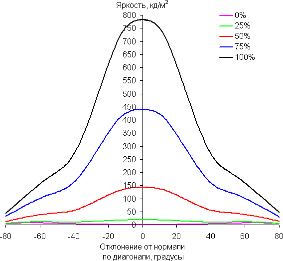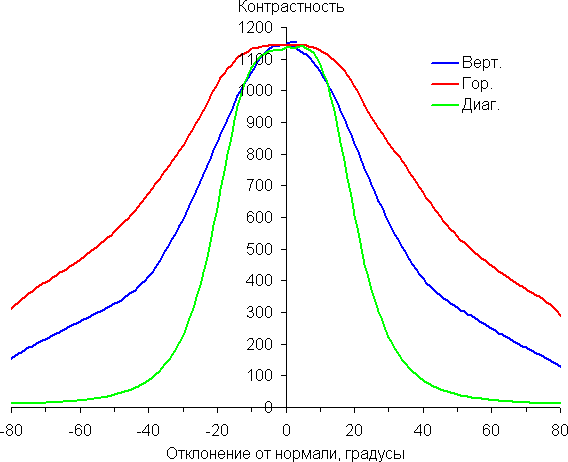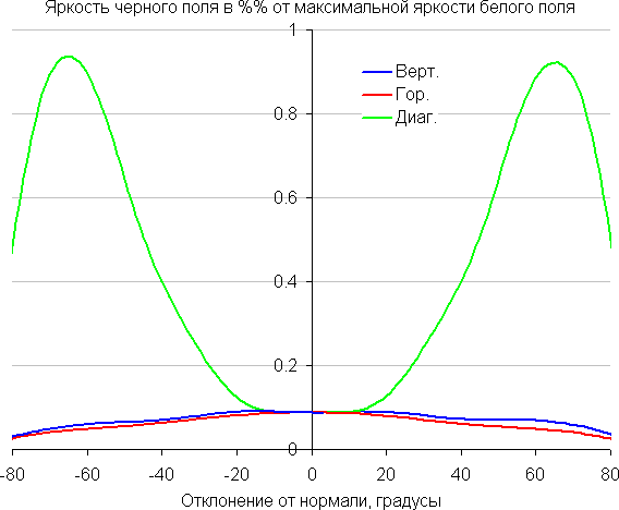 Отметим относительно плавное уменьшение яркости при отклонении от перпендикуляра к экрану во всех трех направлениях в относительно широком диапазоне углов, при этом графики яркости полутонов не пересекаются во всем диапазоне измеряемых углов (то есть нет инвертирования яркости оттенков). При отклонении в диагональном направлении яркость черного поля начинает резко возрастать уже при 20°-30° отклонения от перпендикуляра к экрану. Если сидеть недалеко от экрана, то черное поле по углам могло бы быть заметно светлее, чем в центре, но без вмешательства в сервисные установки этого нельзя увидеть, так как черные поля локально затемняются. Контрастность в диапазоне углов ±82° в случае отклонения по диагонали приближается к отметке 10:1, но не опускается ниже.