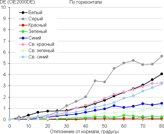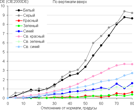 Для количественной характеристики изменения цветопередачи мы провели колориметрические измерения для белого, серого (127, 127, 127), красного, зеленого и синего, а также светло-красного, светло-зеленого и светло-синего полей во весь экран с использованием установки, подобной той, что применялась в предыдущем тесте. Измерения проводились в диапазоне углов от 0° (датчик направлен перпендикулярно к экрану) до 80° с шагом в 5°. Полученные значения интенсивностей были пересчитаны в отклонение ΔE относительно замера каждого поля при перпендикулярном положении датчика относительно экрана. Результаты представлены ниже: