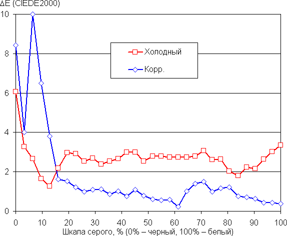 Графики ниже показывают цветовую температуру на различных участках шкалы серого и отклонение от спектра абсолютно черного тела (параметр ΔE) при выборе варианта Холодный (максимальная яркость и контрастность) для настройки Оттенок и после небольшой коррекции цветового баланса настройками усиления трех основных цветов (значения 0, −14 и −8 для усиления красного, зеленого и синего цветов после выбора варианта Теплый2):