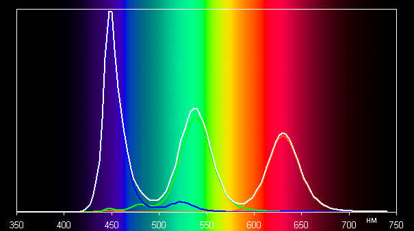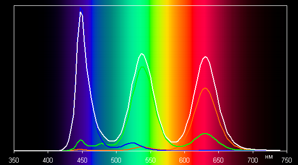Ниже приведен спектр для белого поля (белая линия), наложенный на спектры красного, зеленого и синего полей (линии соответствующих цветов) для профиля Исходный: