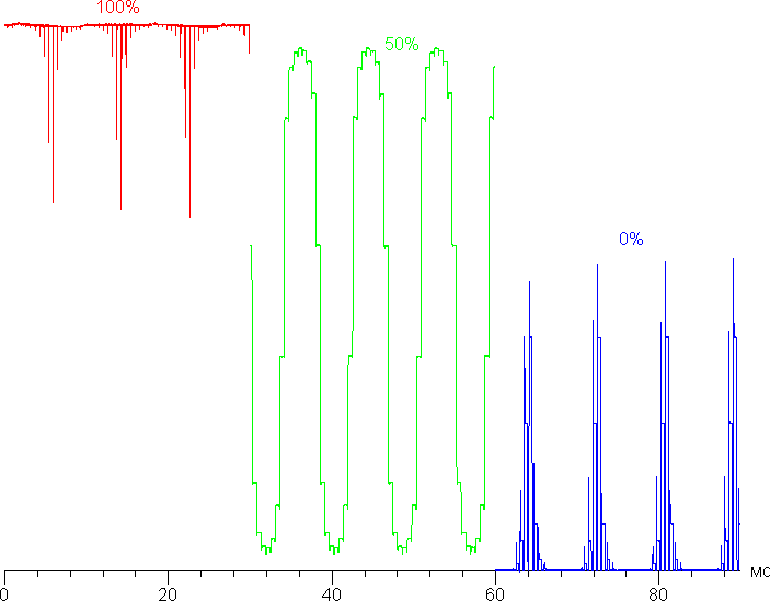 Управление яркостью свечения каждого из светодиодов подсветки осуществляется с помощью ШИМ с частотой 120 Гц. Ниже приведена зависимость яркости от времени, числа — это значения настройки Яркость: