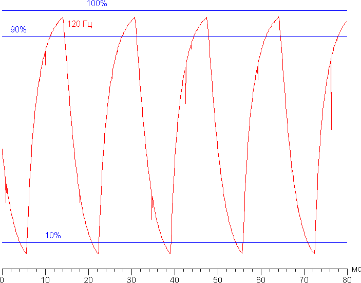 Скорости матрицы достаточно для полноценного вывода изображения с частотой 120 Гц. В подтверждение приведем зависимость яркости от времени при чередовании белого и черного поля (на части площади экрана) при 120 Гц кадровой частоты (график с подписью 120 Гц):