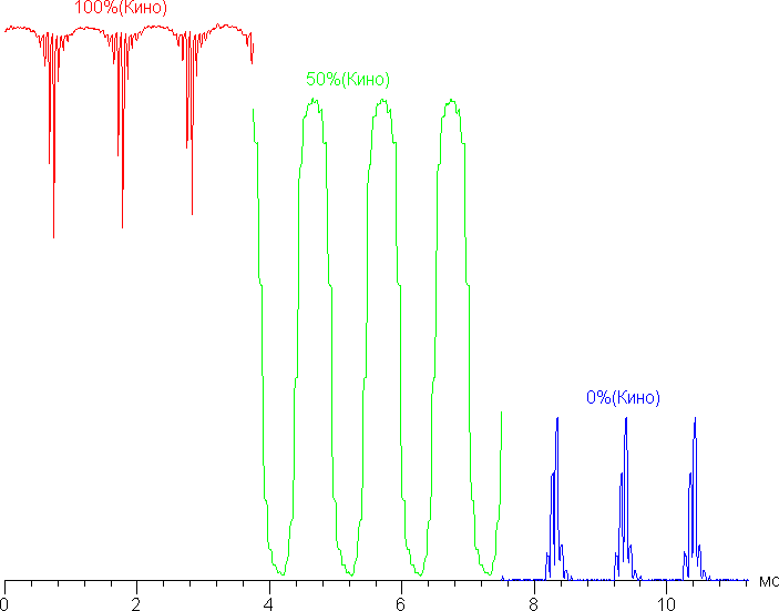Однако, если включить режим Кино, то частота ШИМ возрастает до 960 Гц, что в совокупности с зональностью очень сильно снижает заметность мерцания — в обычных условиях его не видно. Ниже приведена зависимость яркости от времени для режима Кино.