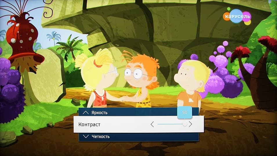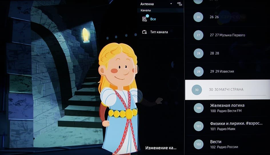 Отметим, что в целом ни к стабильности работы, ни к отзывчивости оболочки у нас никаких претензий не возникло. На команды с пульта ТВ реагирует почти моментально. Несмотря на разнообразную анимацию и звуковые эффекты, навигация по меню быстрая. Правда, нет кнопки быстрого доступа к настройкам, а возврат из меню с настройками к текущему просмотру выполняется через главный экран. Меню с настройками ТВ занимает большую часть экрана, надписи в нем читаемые.