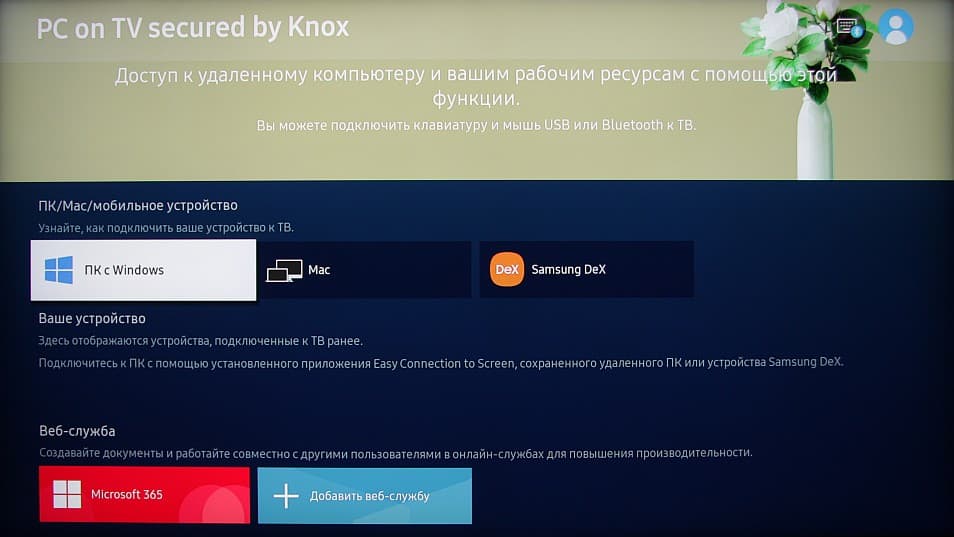Нужно отметить, что в целом интерфейс хорошо оптимизирован для использования только комплектного пульта ДУ, то есть подключать клавиатуру и мышь, в общем-то, не обязательно, но они пригодятся еще в трех сетевых функциях: доступ к удаленному рабочему столу, подключение к мобильному устройству и работа в Office 365. Нами была подтверждена работоспособность доступа к удаленному рабочему столу (Remote Desktop Connection). В этом режиме плеер ТВ может воспроизводить мультимедийный контент из доступных общих папок ПК. Режим Samsung DeX и работу в Office 365 мы не проверяли.