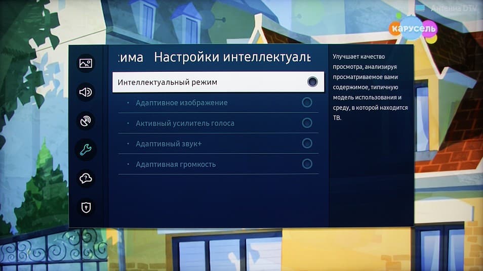 Отметим, что в этом ТВ есть функция, которая для автоматической настройки параметров звука и изображения использует данные, полученные с микрофона и с датчика освещенности.