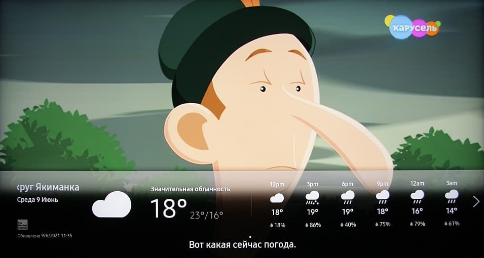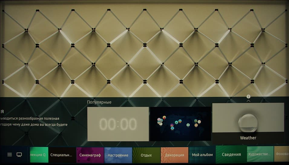 Специальный режим Ambient предназначен для демонстрации заставки на условно выключенном телевизоре. В этот режим работающий телевизор переключается или из главного меню, или из приложения SmartThings, или голосовой командой. Видов заставок несколько. В основном это какое-то изображение, на котором что-то меняется, зачастую есть и звуковое сопровождение. Также присутствуют заставки с часами и метеорологическими данными, заставка с картой, на которой пользователь может отметить столицы стран, где он побывал, есть и просто варианты фоновой заливки с текстурами.