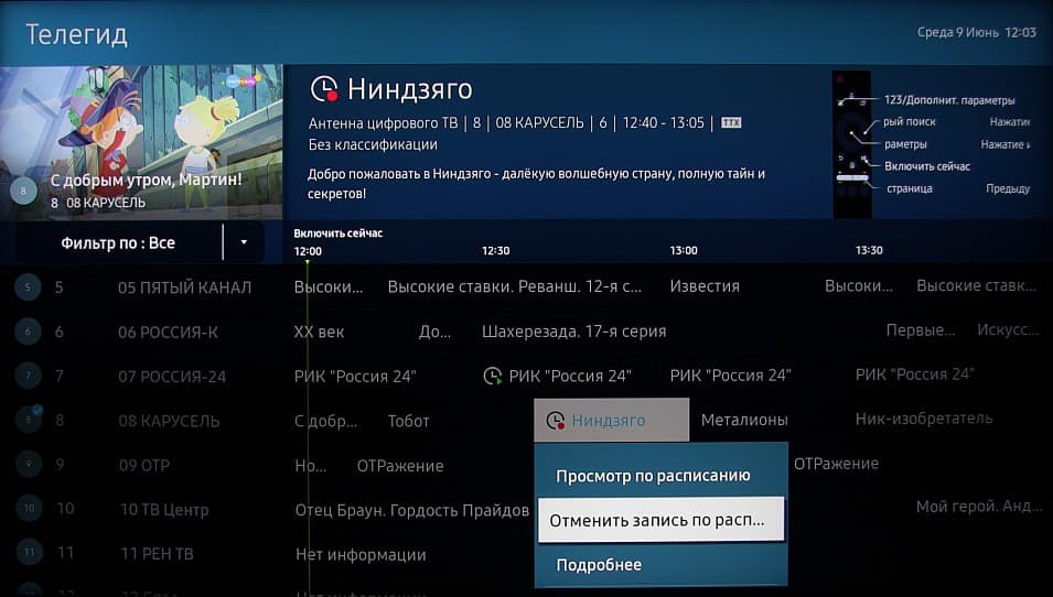 Отметим, что при настройках по умолчанию телевизор отлично обрабатывает и масштабирует изображение, поэтому даже картинка в исходном стандартном разрешении на этом большом экране смотрится хорошо. Присутствуют списки любимых каналов. Есть отличная поддержка электронной программы передач (если она передается) — можно посмотреть, что именно идет на текущем и других каналах, запрограммировать просмотр или запись программы или сериала и т. д.