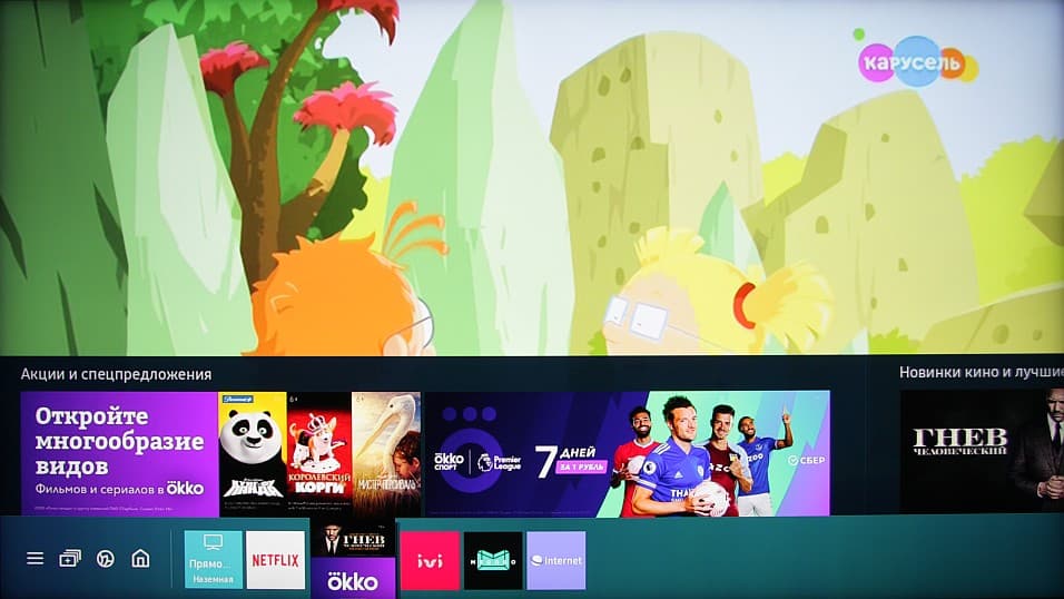 Программной платформой для этого ТВ служит открытая операционная система Tizen, основанная на ядре Linux. Заглавная страница интерфейса представляет собой две горизонтальные ленты. Верхняя — с контекстным содержимым, например, с подписанными миниатюрами быстрых настроек, входов и устройств или с рекомендованным контентом, соответствующим выбранному приложению. На нижней ленте размещены значки выбора функций, источников, плитки-миниатюры установленных программ и т. д. Плитки на нижней ленте (именно плитки) можно переставлять и удалять, а также добавлять к ним плитки установленных приложений и плитки прямого выбора входов. Неприятным моментом является периодически появляющаяся не очень навязчивая реклама в виде одной из плиток в нижнем ряду.