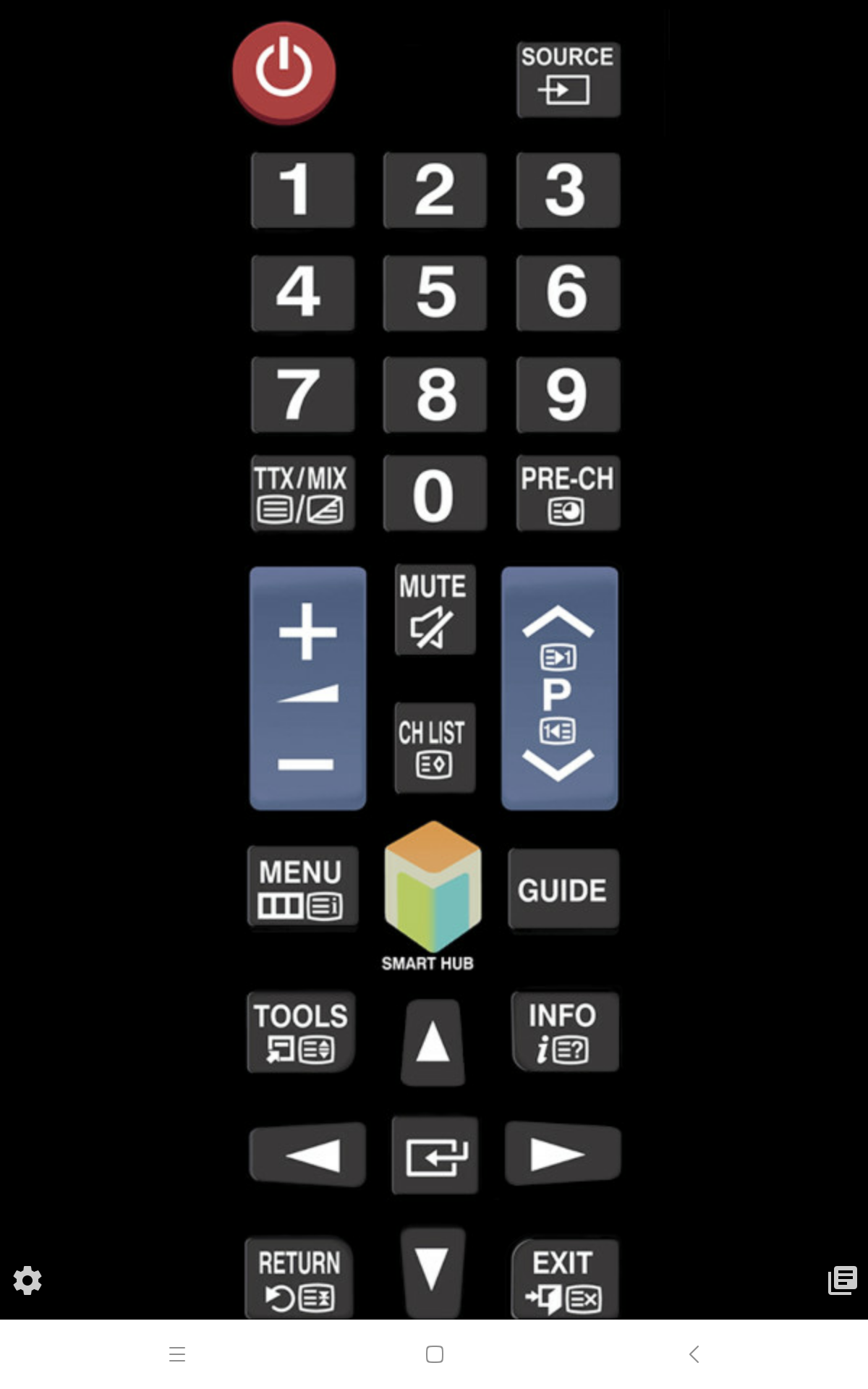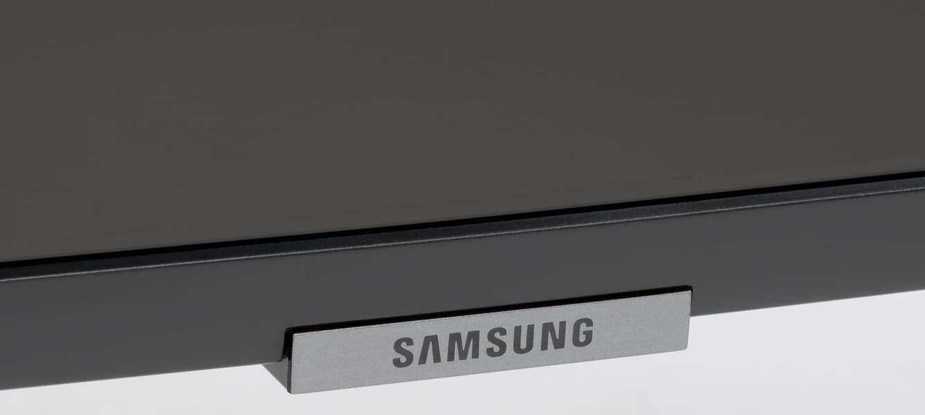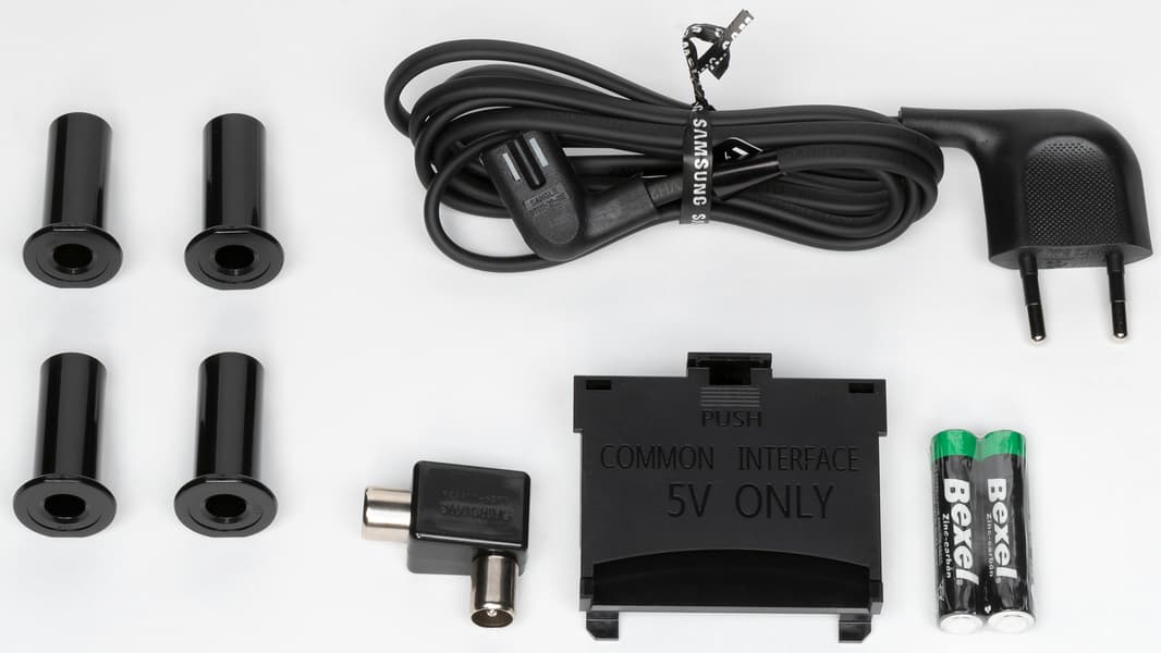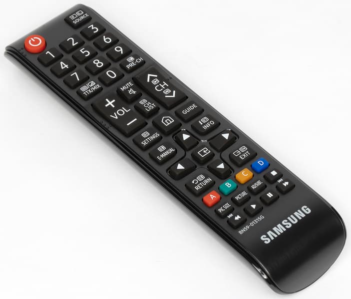 Корпус пульта изготовлен из черного пластика с матовой поверхностью, а кнопки — из резиноподобного материала. Пульт удобно лежит в руке. В отличие от топовых серий ТВ Samsung на пульте к этому телевизору кнопок много. Их обозначения контрастные, но некоторые уж слишком мелкие и трудночитаемые, да и ряд самих кнопок тоже слишком мелкие и расположены очень тесно. Есть две кнопки-качельки изменения громкости и переключения ТВ-каналов, которые легко находятся на ощупь. Подсветки, конечно, нет. Работает пульт по ИК. Есть возможность настроить этот пульт на управление другой аудио- и видеотехникой, но для управления сторонней техникой используются передача команд с помощью ИК-излучателей на самом ТВ, что снижает ценность данной функции почти до нуля, так как подключенная к ТВ техника редко находится перед телевизором.