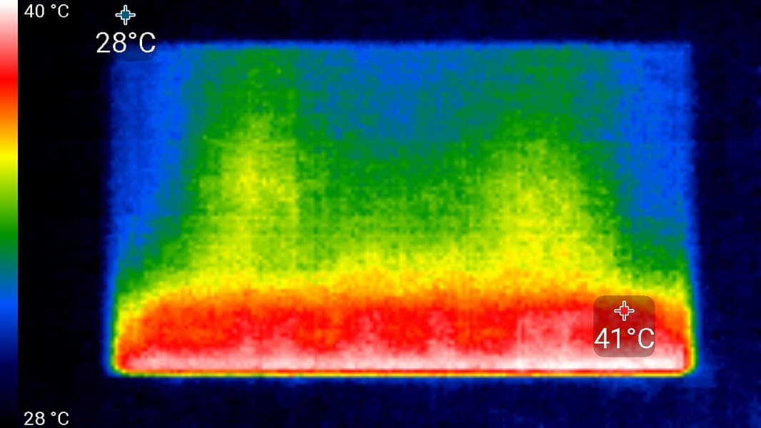 Нижний край экрана нагрелся до 41 °C максимум. Видимо, внизу находится светодиодная линейка подсветки экрана.