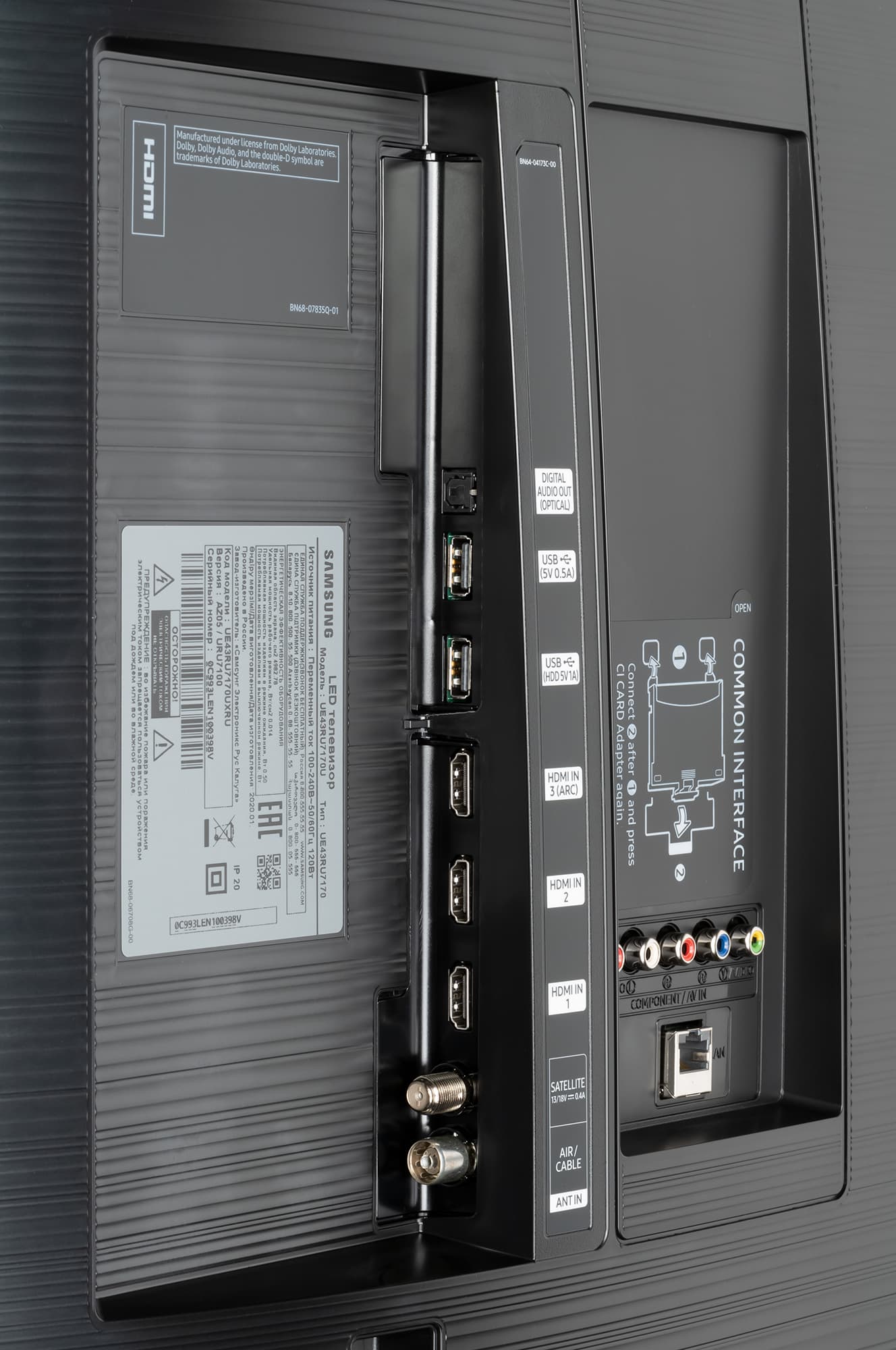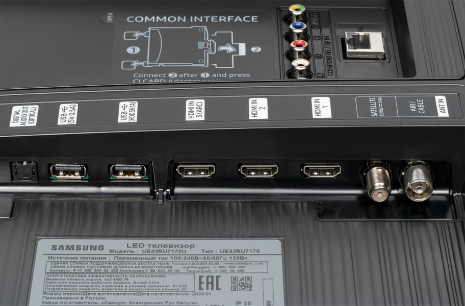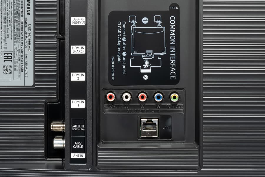 Основные интерфейсные разъемы размещены в двух нишах на задней панели и направлены вбок или назад. Подключать кабели к разъемам относительно удобно, затруднение может быть только с кабелем проводной сети, когда телевизор висит на стене (аналоговые интерфейсы в виду их низкой актуальности не учитываем). Над аналоговыми входами есть разъем для адаптера карты CI, закрытый наклейкой с инструкцией по установке этого адаптера.