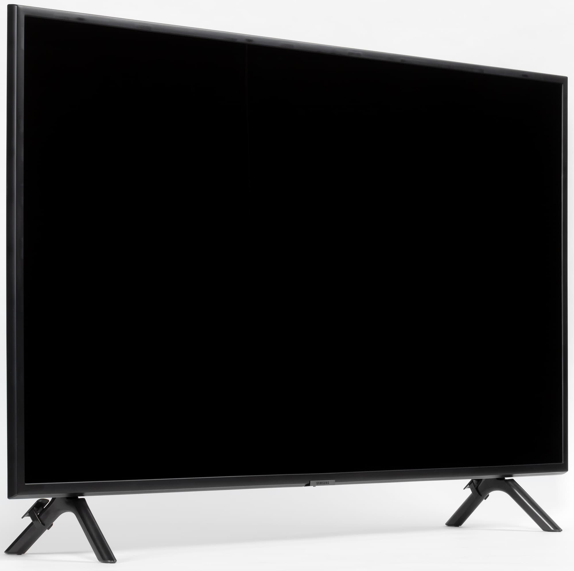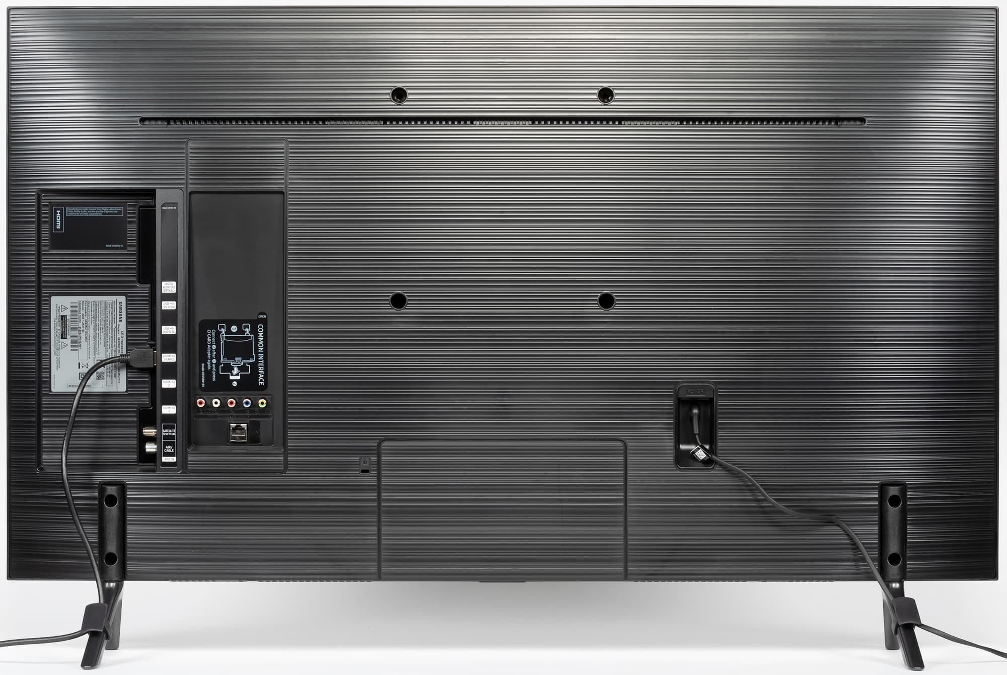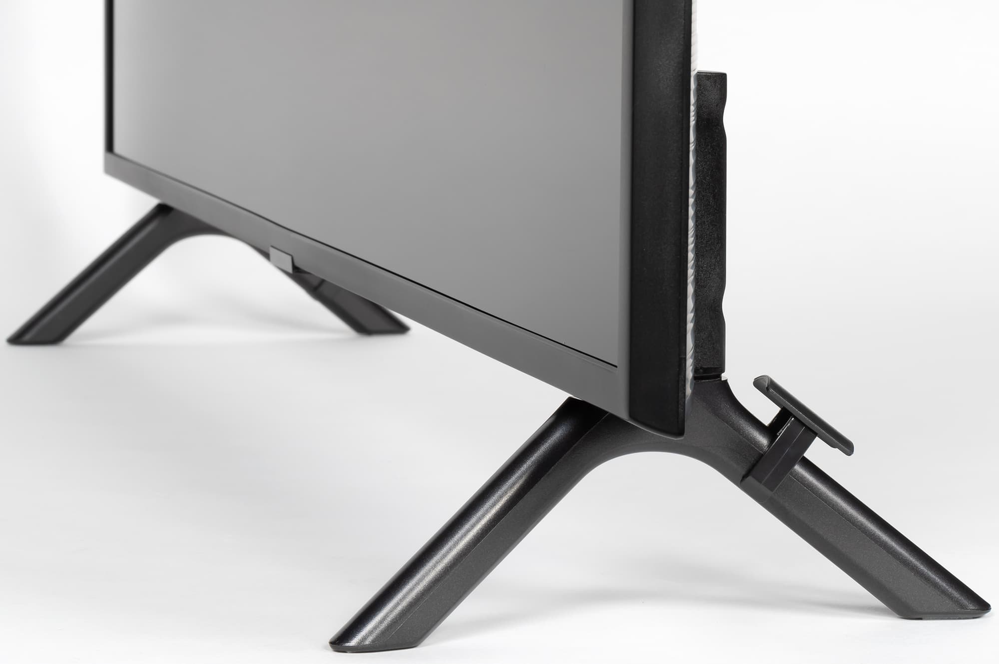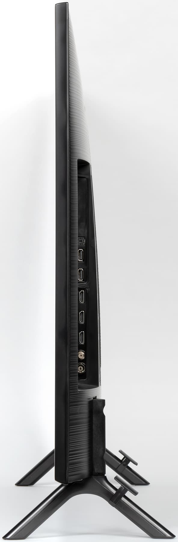 Расстояние между ножками примерно 80 см. Сзади на каждую из ножек можно нащелкнуть кабельный фиксатор, чтобы кабели спускались назад по ножкам и не ухудшали вид телевизора спереди и сзади. Стоит телевизор устойчиво, жесткость конструкции подставки достаточная. Телевизор, установленный на горизонтальную поверхность на штатную подставку, стоит вертикально без видимого наклона.