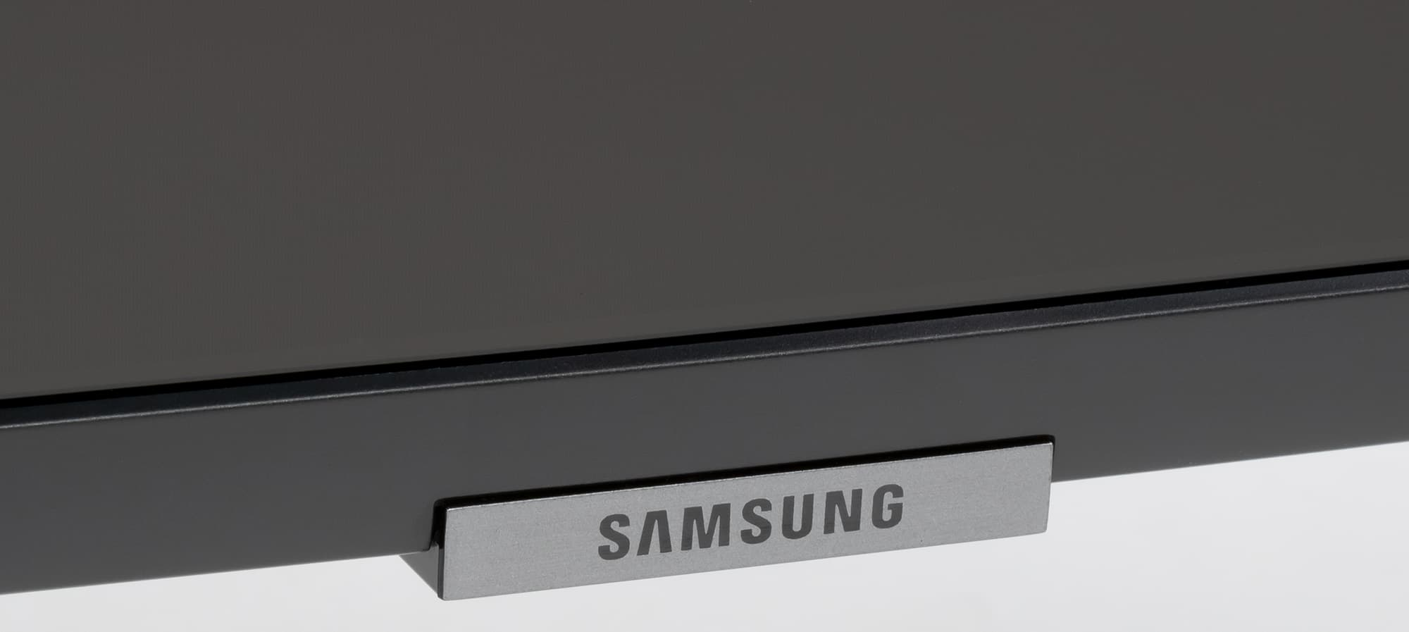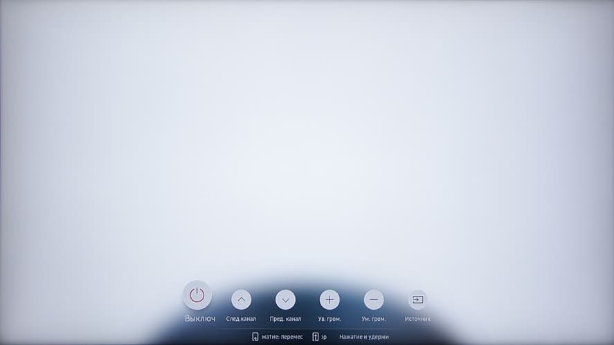За логотипом скрываются ИК-приемник пульта ДУ, ИК-излучатели для управления подключенной к ТВ техникой и датчик внешней освещенности. На нижнем торце накладки находится единственная кнопка управления. Ей с помощью короткого меню можно очень ограниченно управлять телевизором, когда пульт не доступен: