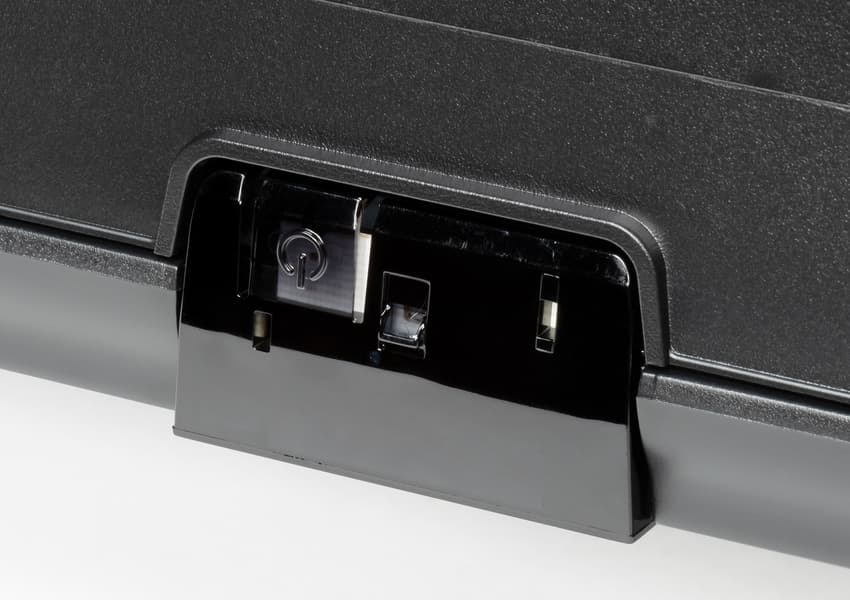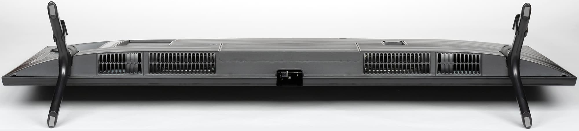 Телевизор имеет полностью пассивное охлаждение. За решетками на нижнем торце расположены встроенные громкоговорители с вытянутыми диффузорами.