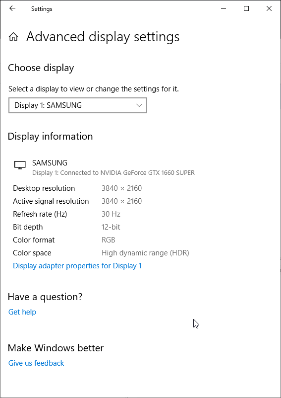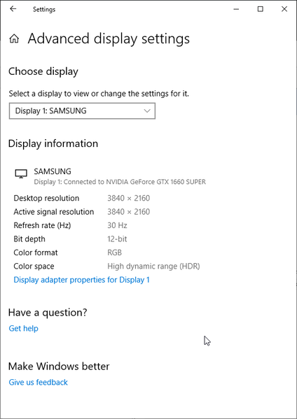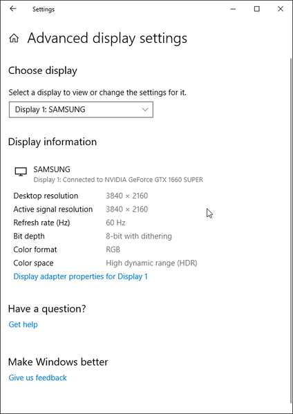 Под Windows 10 вывод в режиме HDR на данный телевизор возможен при выборе соответствующих опций в настройках дисплея. При разрешении 4К и 60 Гц вывод идет в режиме 8 бит на цвет, дополненных динамическим смешением цветов, видимо, с помощью видеокарты на аппаратном уровне. При 30 Гц — 12 бит на цвет (динамическое расширение до 10 бит выполняется уже самим ТВ):