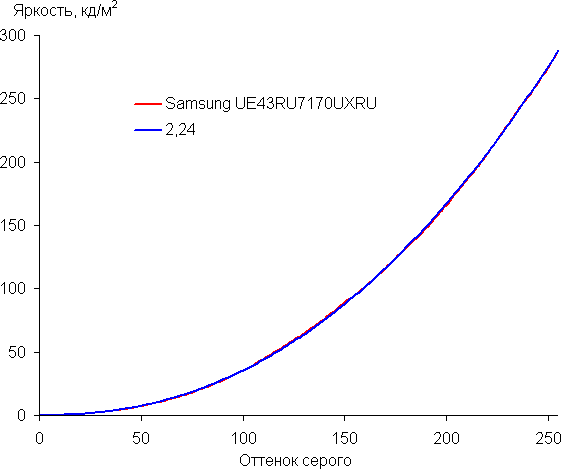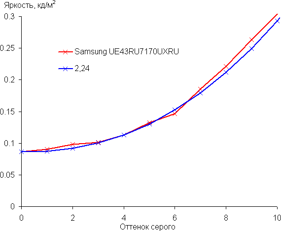 Аппроксимация полученной гамма-кривой дала показатель 2,24, что немного выше стандартного значения 2,2. При этом реальная гамма-кривая мало отклоняется от аппроксимирующей степенной функции: