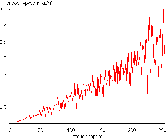 Реальная гамма-кривая ближе к стандартной в случае варианта Гамма = BT.1886 и коррекции −2, поэтому далее мы измерили яркость 256 оттенков серого (от 0, 0, 0 до 255, 255, 255) при этом значении. График ниже показывает прирост (не абсолютное значение!) яркости между соседними полутонами: